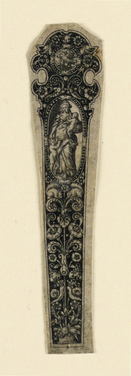 Print, Design for a Knife Handle Showing Charity; Print Maker: Giullaume du Thielt; Netherlands; engraving and etching on off-white laid paper; L x W: 8.6 x 1.3 cm (3 3/8 x 1/2 in.); Museum purchase through gift of Mrs. A. Murray Young; 1946-33-3