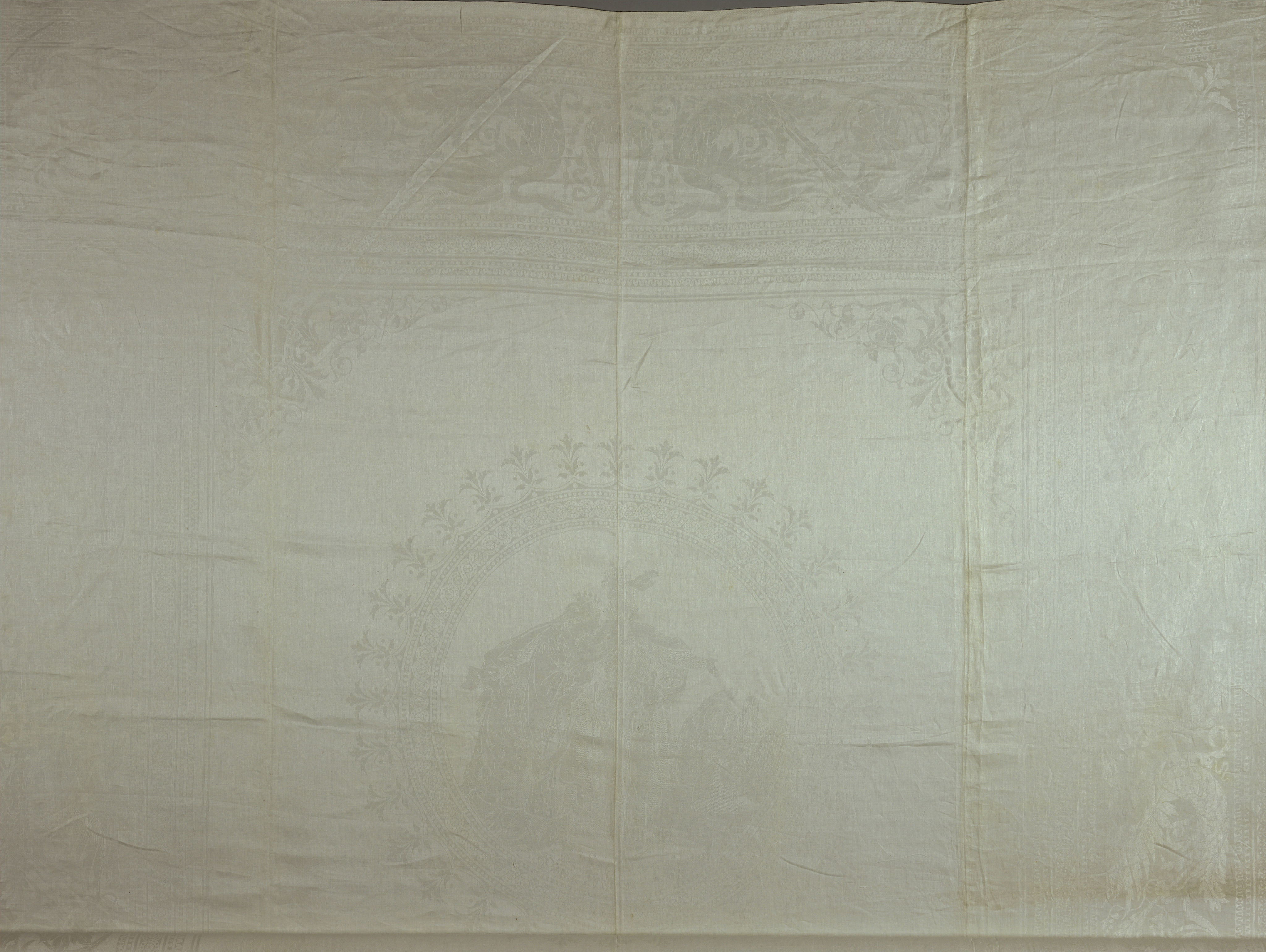 This is a Tablecloth. It is dated 19th century and we acquired it in 1946. Its medium is linen, cotton and its technique is damask. It is a part of the Textiles department.
