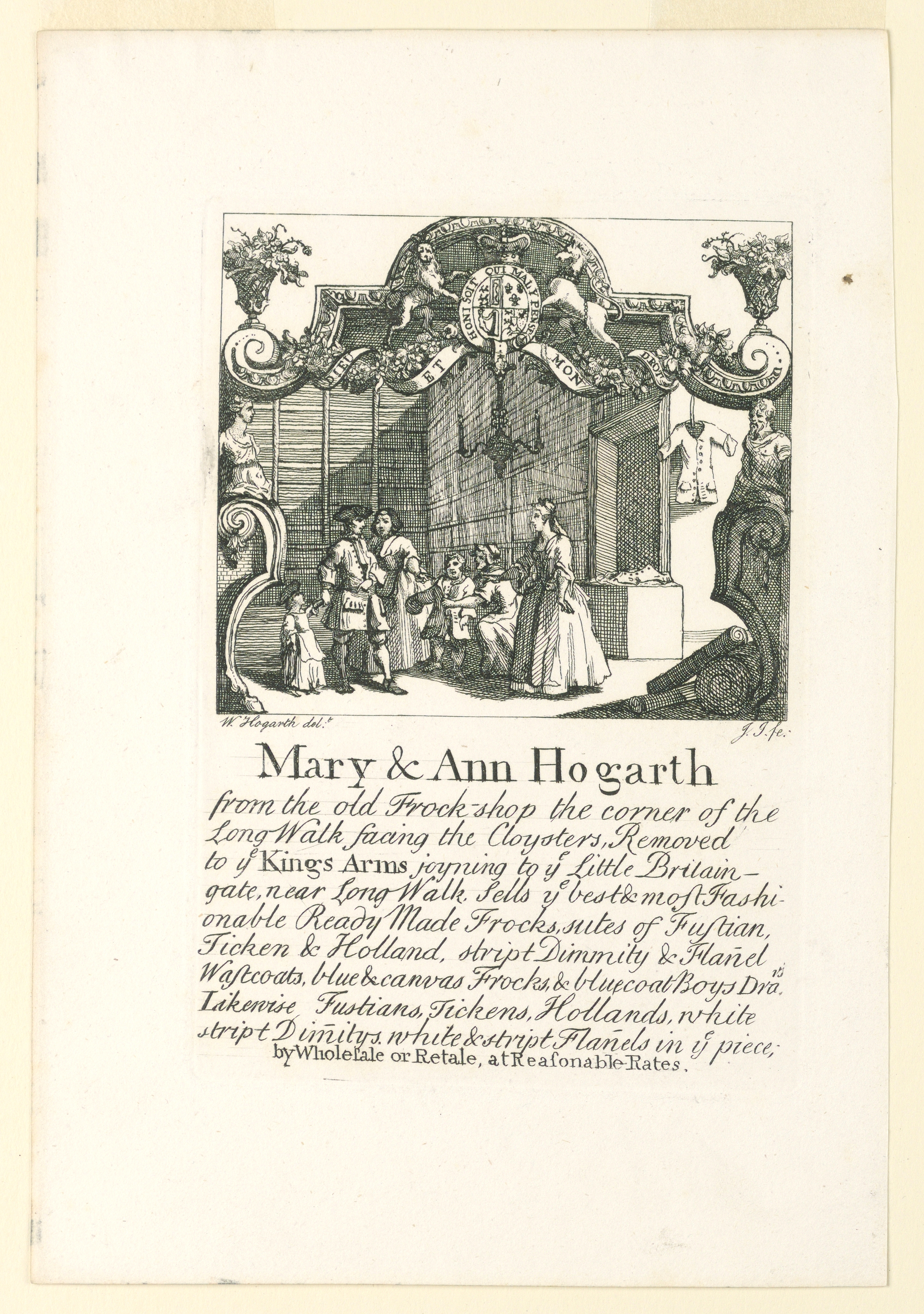 Below, inscription: "Mary & Ann Hogarth/from the old Frock-shop...at Reasonable-Rates"; inscribed, below, the picture: lower left, "W. Hogarth delt.; lower left: "J.I. fe:"