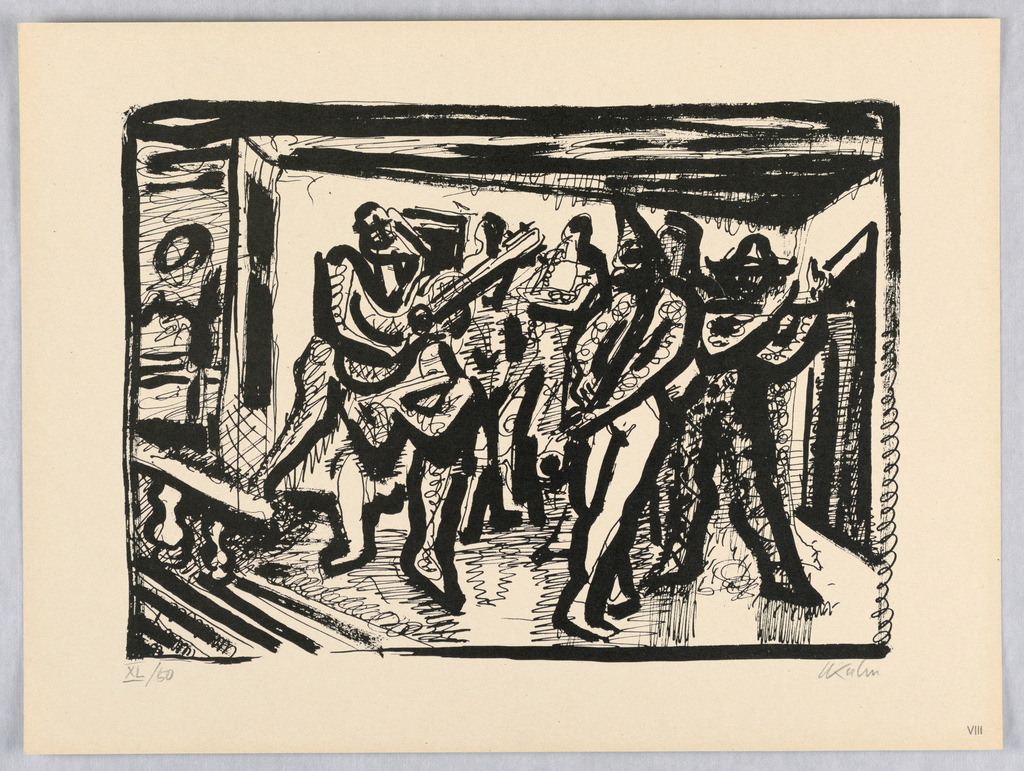 Print, Musikanten; Hans Kuhn; Germany; lithograph in black ink on paper; Image: 23 × 31 cm (9 1/16 × 12 3/16 in.) Sheet: 29.5 × 40 cm (11 5/8 × 15 3/4 in.); 1949-4-8