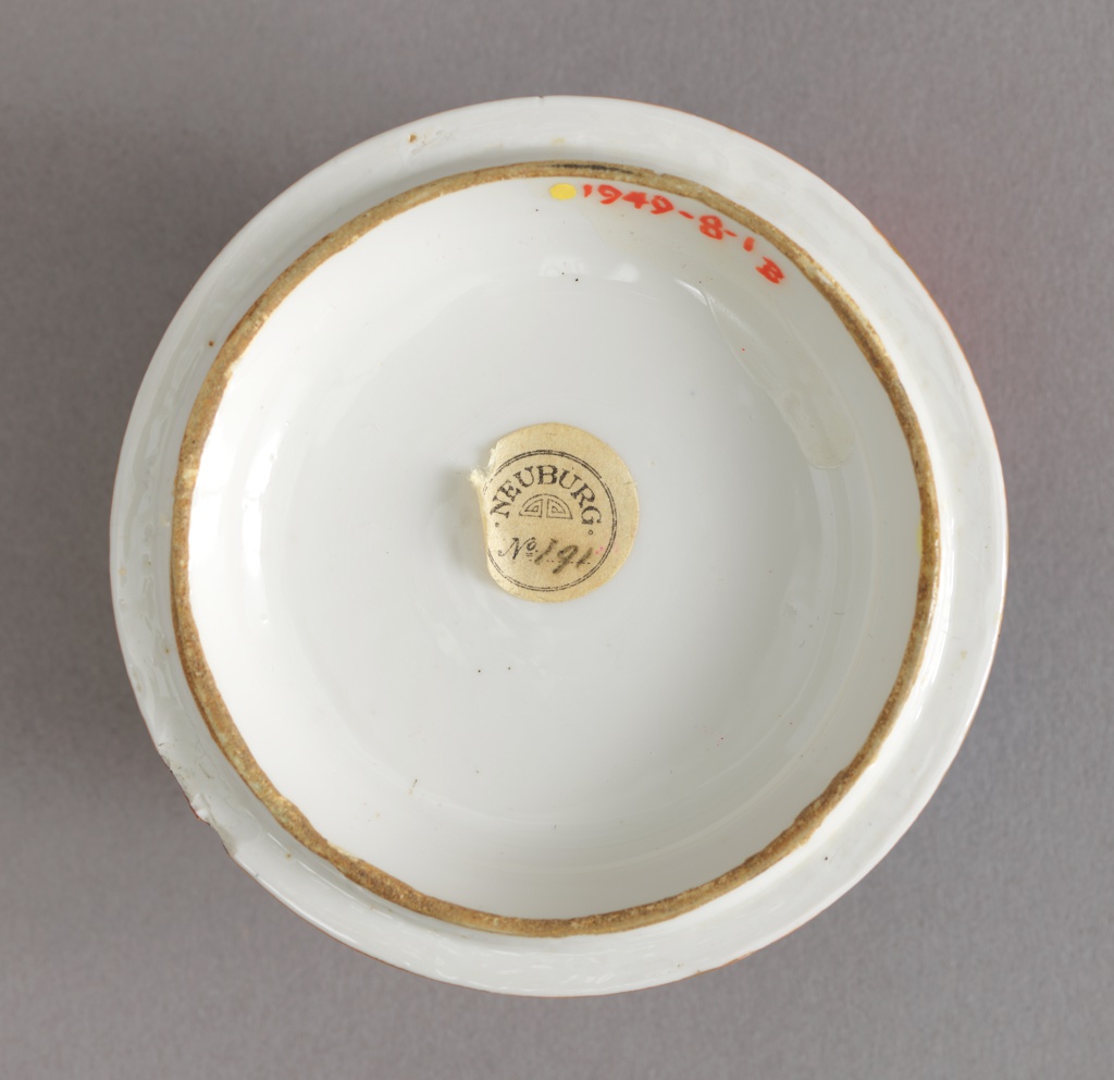 Underside: [1] a shield with criss cross pattern and a circle with three lines within, impressed underglaze (manufactory mark) [2] crowned "V" with "KLESSHEIM" in horizontal bar, printed in red, blue, and silver on paper label [3] "NEUBURG / No.191", printed and written on round paper label [4] two lines, incised underglaze Reverse of lid: [1] "NEUBURG / No.191", printed and written on round paper label