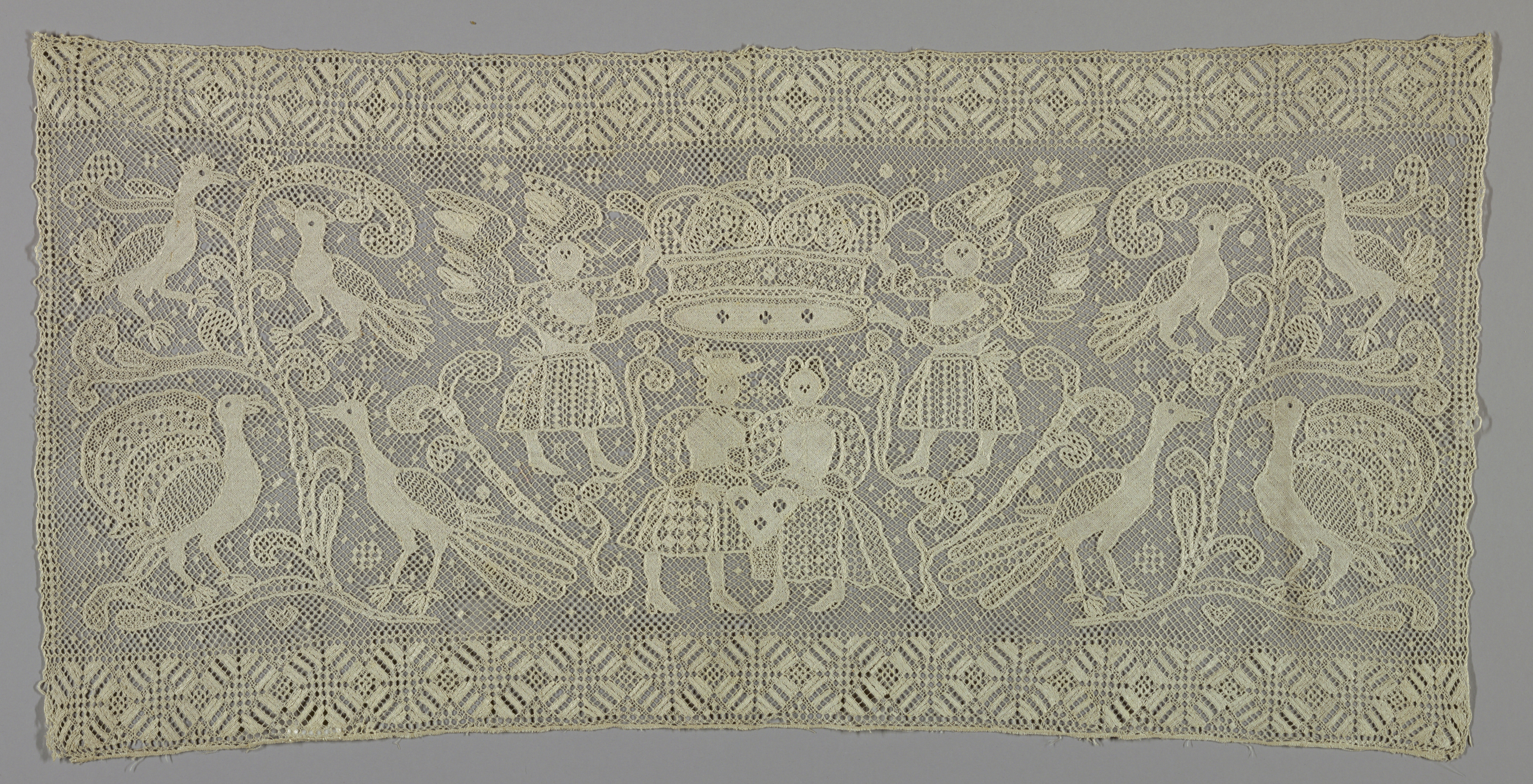 This is a panel. It is dated 18th century and we acquired it in 1950. Its medium is linen and its technique is needlework on knotted net. It is a part of the Textiles department.