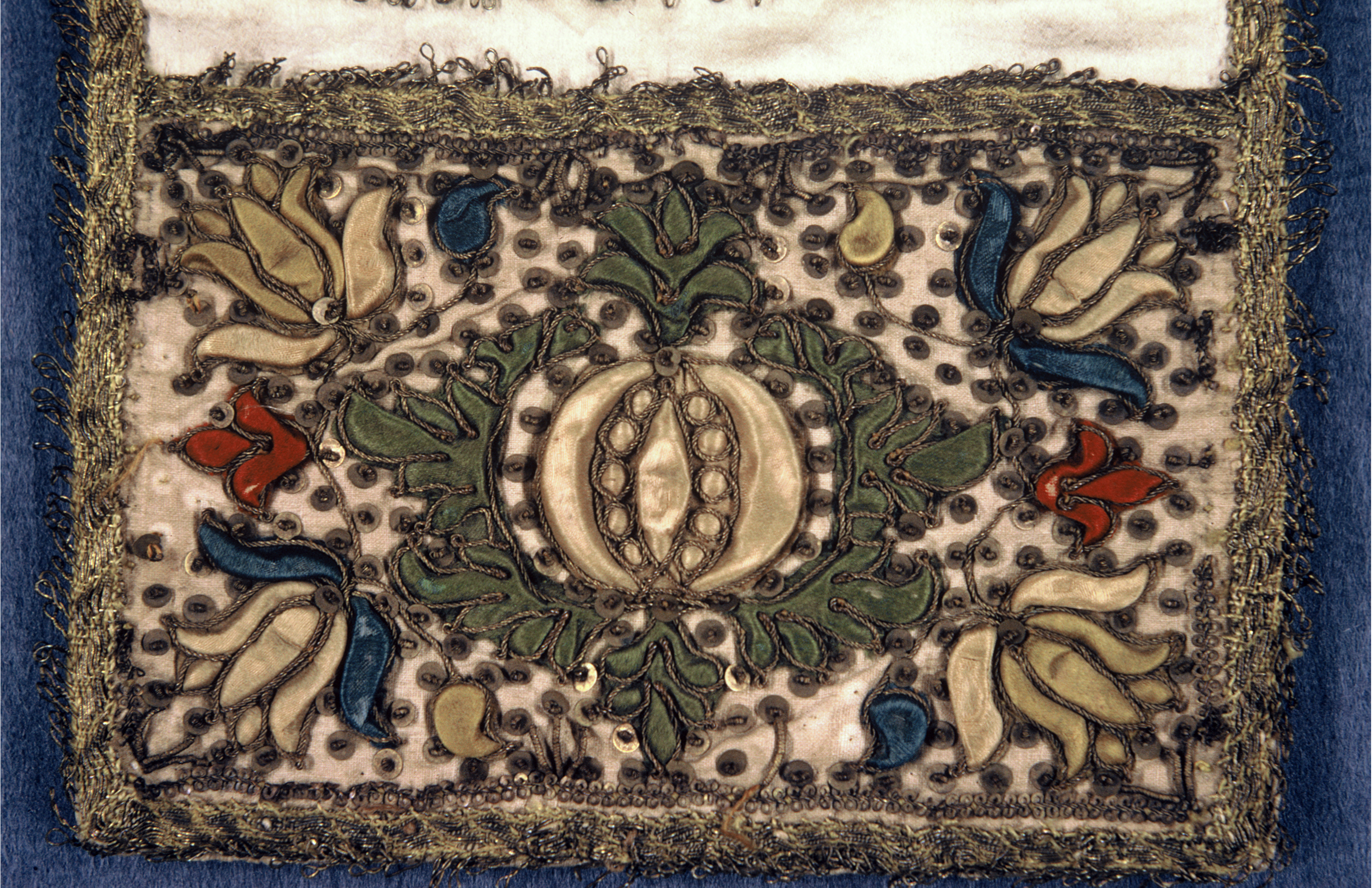 This is a Wall pocket. It is dated late 17th–early 18th century and we acquired it in 1950. Its medium is silk, metallic thread, metal paillettes, gilt wire and its technique is embroidered on plain weave; appliqué of padded silk satin stich and couching on natural linen plain weave; couched gold-wrapped silk and gilt wire plus attached coils of gilt wire and spangles. It is a part of the Textiles department.