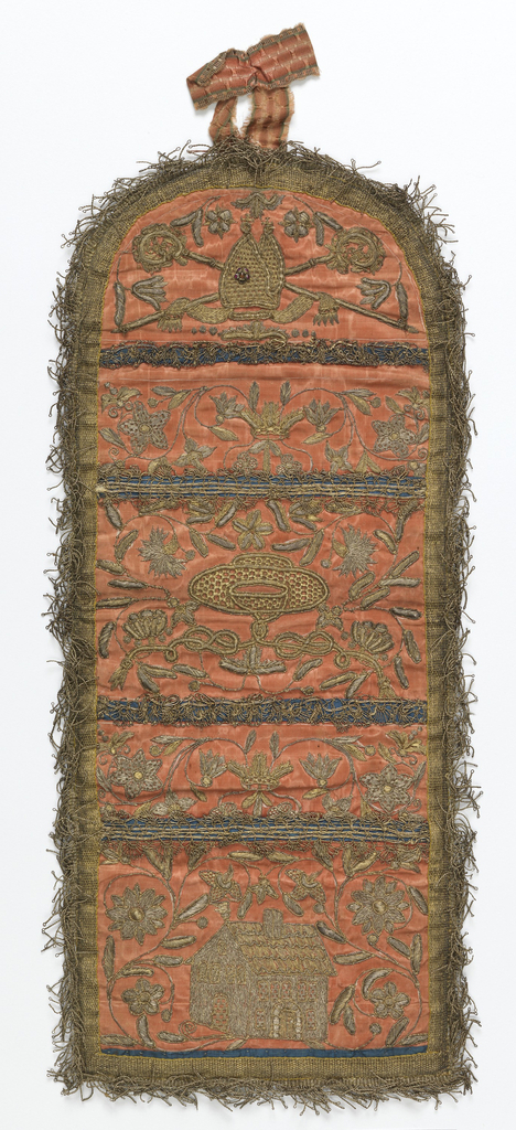 This is a Wall pocket. It is dated 18th century and we acquired it in 1950. Its medium is silk, metal and its technique is embroidery on coral silk plain weave moire. stem and satin stitches plus couching using gold and silver-wrapped silk; attached bobbin-lace of gold-wrapped silk. It is a part of the Textiles department.