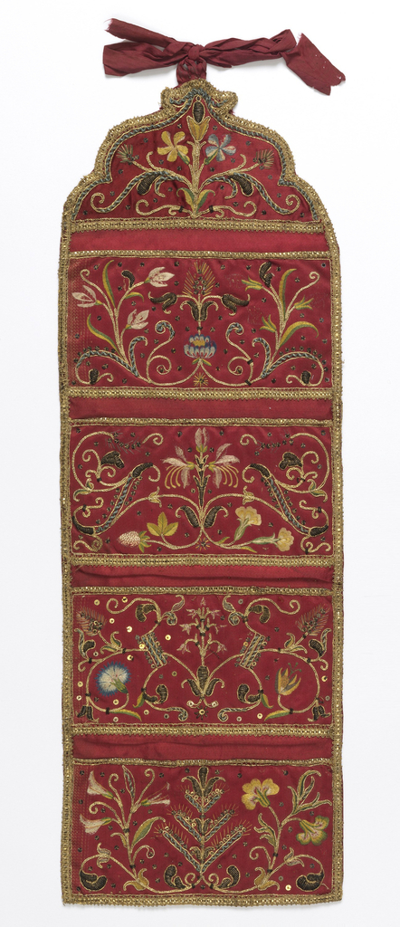 This is a Wall pocket. It is dated early 18th century and we acquired it in 1950. Its medium is silk, metal thread and its technique is satin weave with silk and metal thread embroidery. It is a part of the Textiles department.