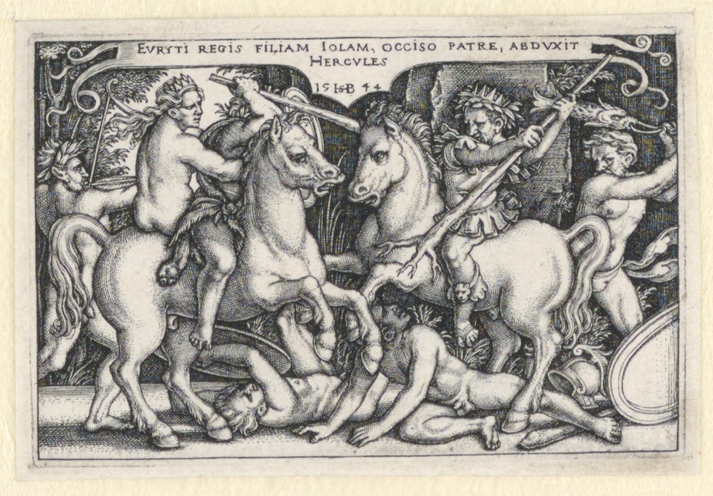 Print, Hercules Abducting Iole; Designed by Hans Sebald Beham (German, 1500–1550); engraving on off-white laid paper; Gift of Leo Wallerstein; 1950-131-58