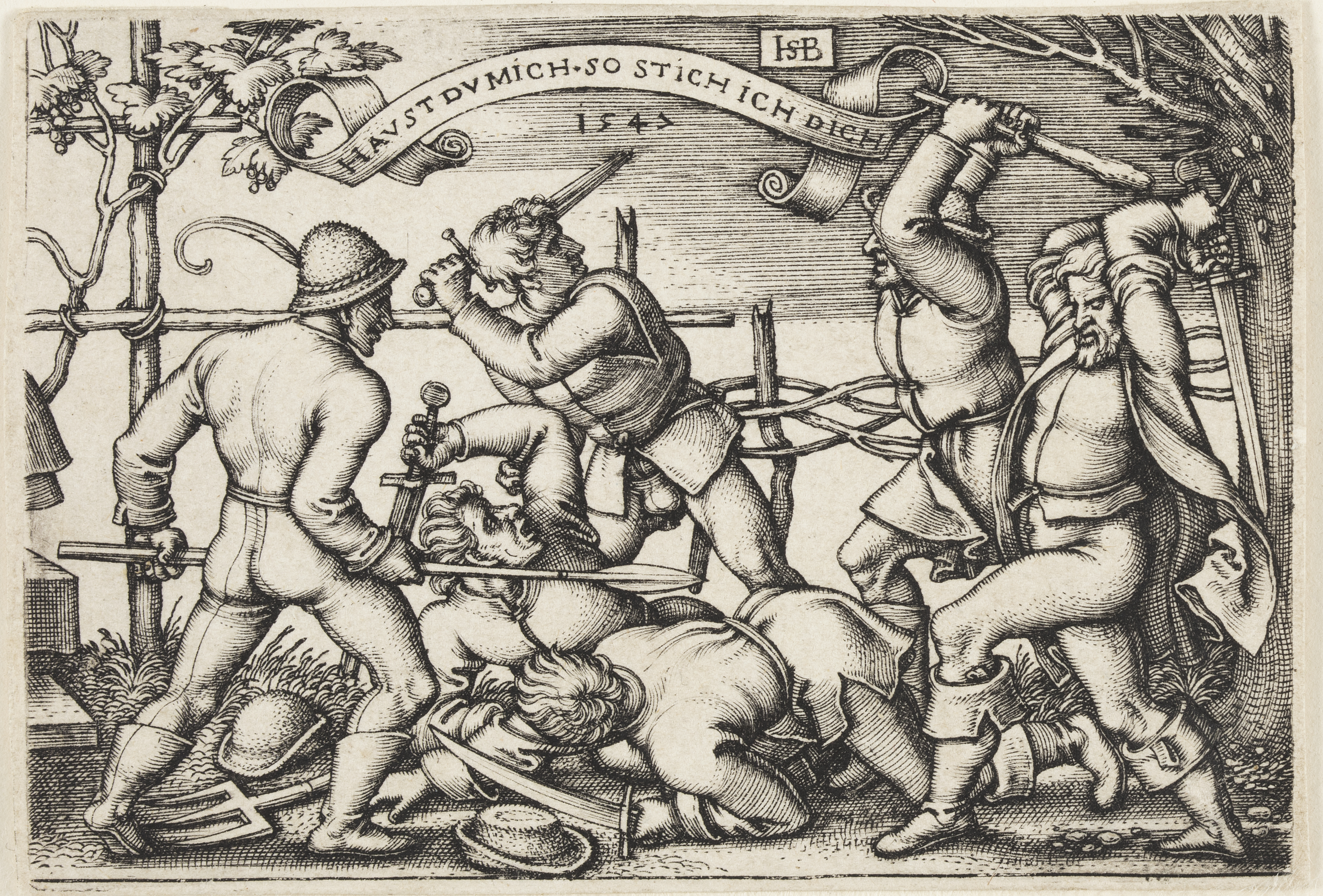 Print, Peasant's Brawl; Print Maker: Hans Sebald Beham (German, 1500–1550); Germany; engraving on off-white laid paper; Gift of Leo Wallerstein; 1950-131-77