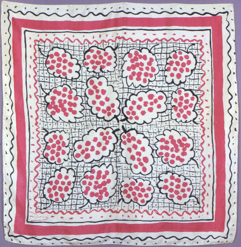 This headscarf is one of a series known as the Ascher Squares, produced as part of an historic collaboration between Ascher Studios, an haute couture textile company in London, and more than fifty modern artists, including Henry Moore, Jean Cocteau, Alexander Calder, and painter André Derain, who designed the headscarf featured here.