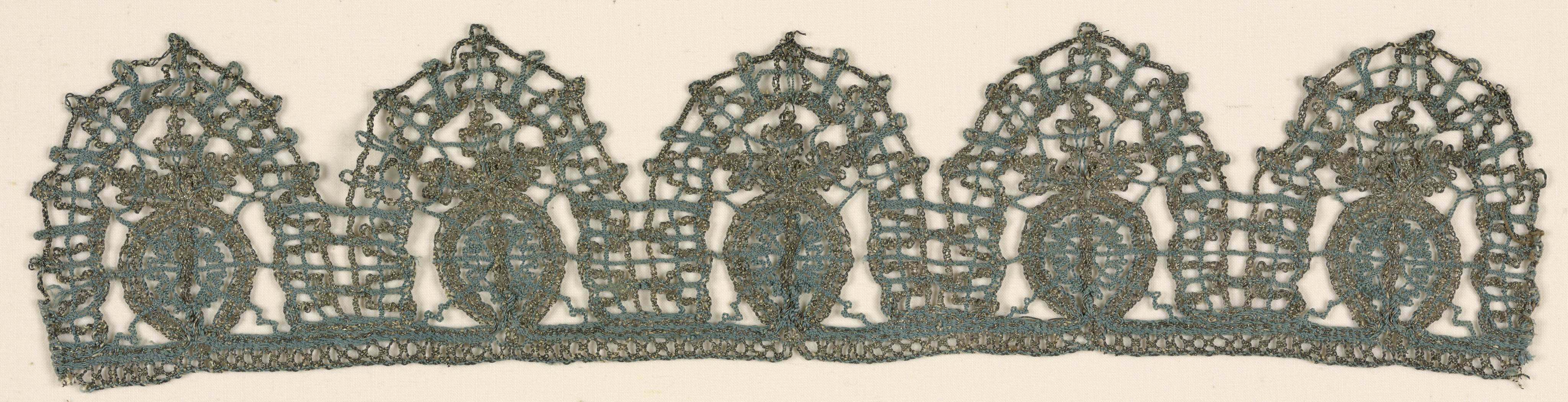 This is a Trimming. It is dated early 17th century and we acquired it in 1950. Its medium is silk dyed blue, silver metallic foil wound onto white silk and its technique is bobbin lace, metallic. It is a part of the Textiles department.
