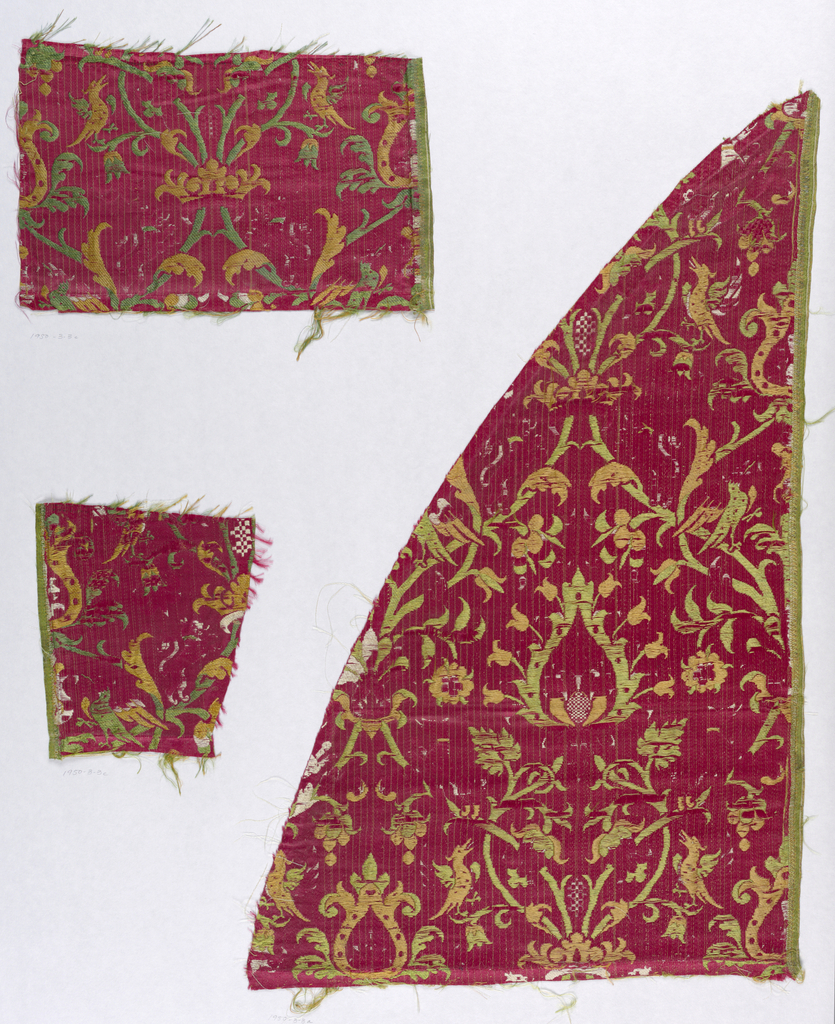 This is a Fragments. It is dated 16th–17th century and we acquired it in 1950. Its medium is silk and its technique is plain compound satin with supplementary weft. It is a part of the Textiles department.