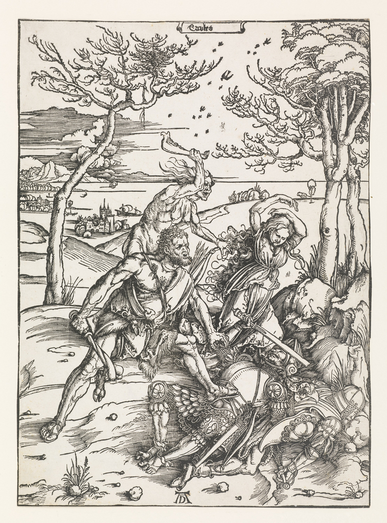 Print, Hercules Conquering the Molionide Twins; Albrecht Dürer (German, 1471–1528); Germany; woodcut on laid paper; 39.1 x 28.2 cm (15 3/8 x 11 1/8 in.); Gift of Leo Wallerstein; 1950-5-14