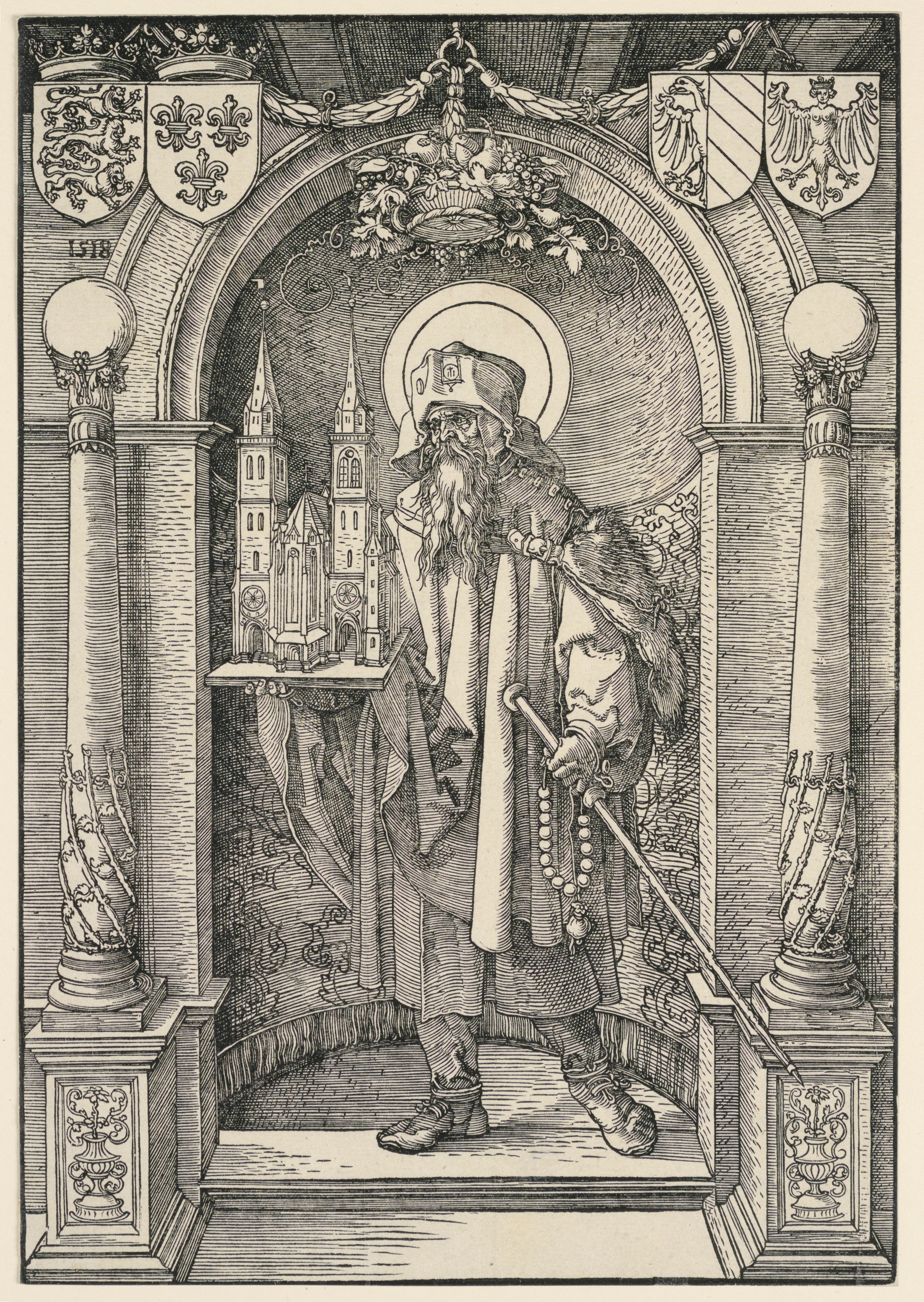 Print, St. Sebaldus; Albrecht Dürer (German, 1471–1528); Print Maker: Hans Springinklee (German, 1490 - 1540); Germany; woodcut and black ink on paper; H x W: 30.1 x 20.8 cm (11 7/8 x 8 3/16 in.); Gift of Leo Wallerstein; 1950-5-25