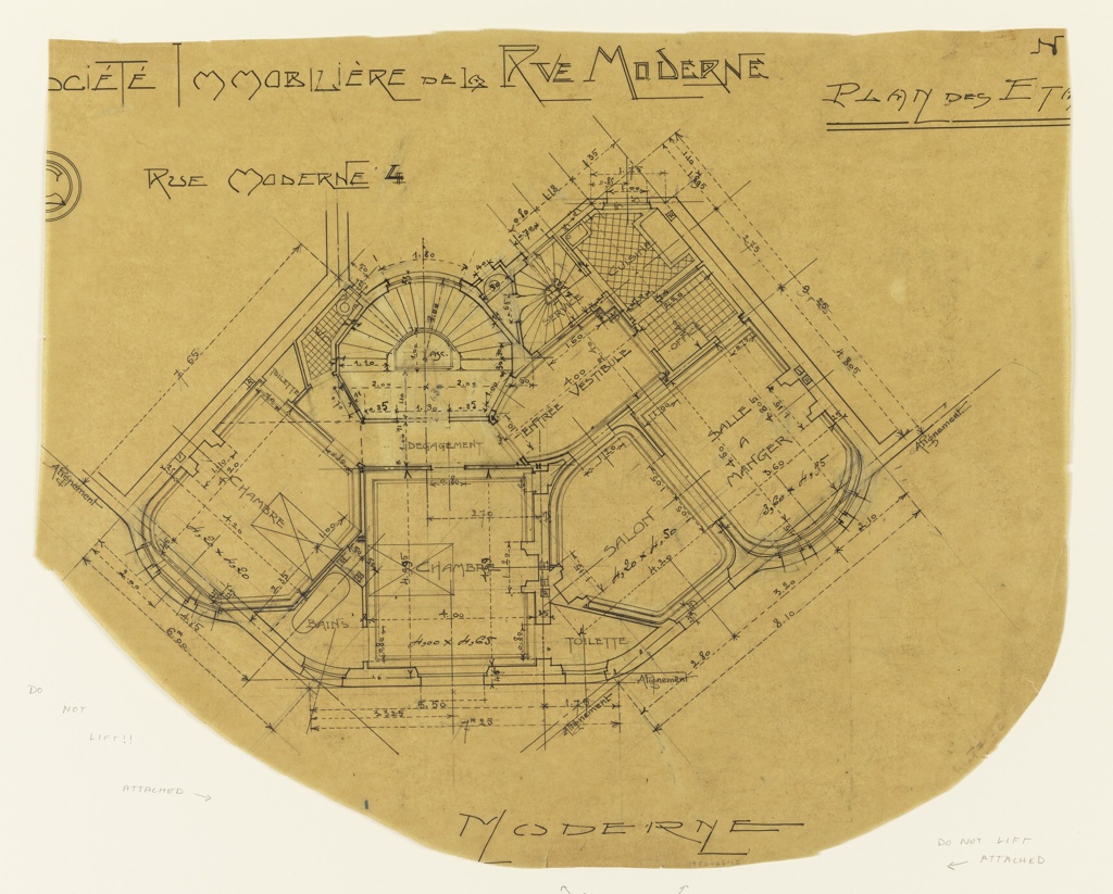 In black ink (cut off), above: Societe Immobiliere de la Rue Mode Bottom in black ink: MODERNE