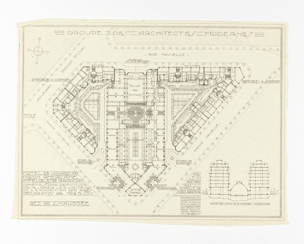 Top in black ink: GROUPE DES ARCHITECTES MODERNES Bottom left in black ink: HOTEL DE VOYAGEURS/ MAISON AMERICAINE/ IMMEUBLES DE RAPPORT/ CONSTRUCTIONS DEFINITIVES/ POUR LOGER LES VISITEURS/ DE L'EXPOSITION DES ARTS/ DECORATIFS DE 1925/ REZ DE CHAUSSEE