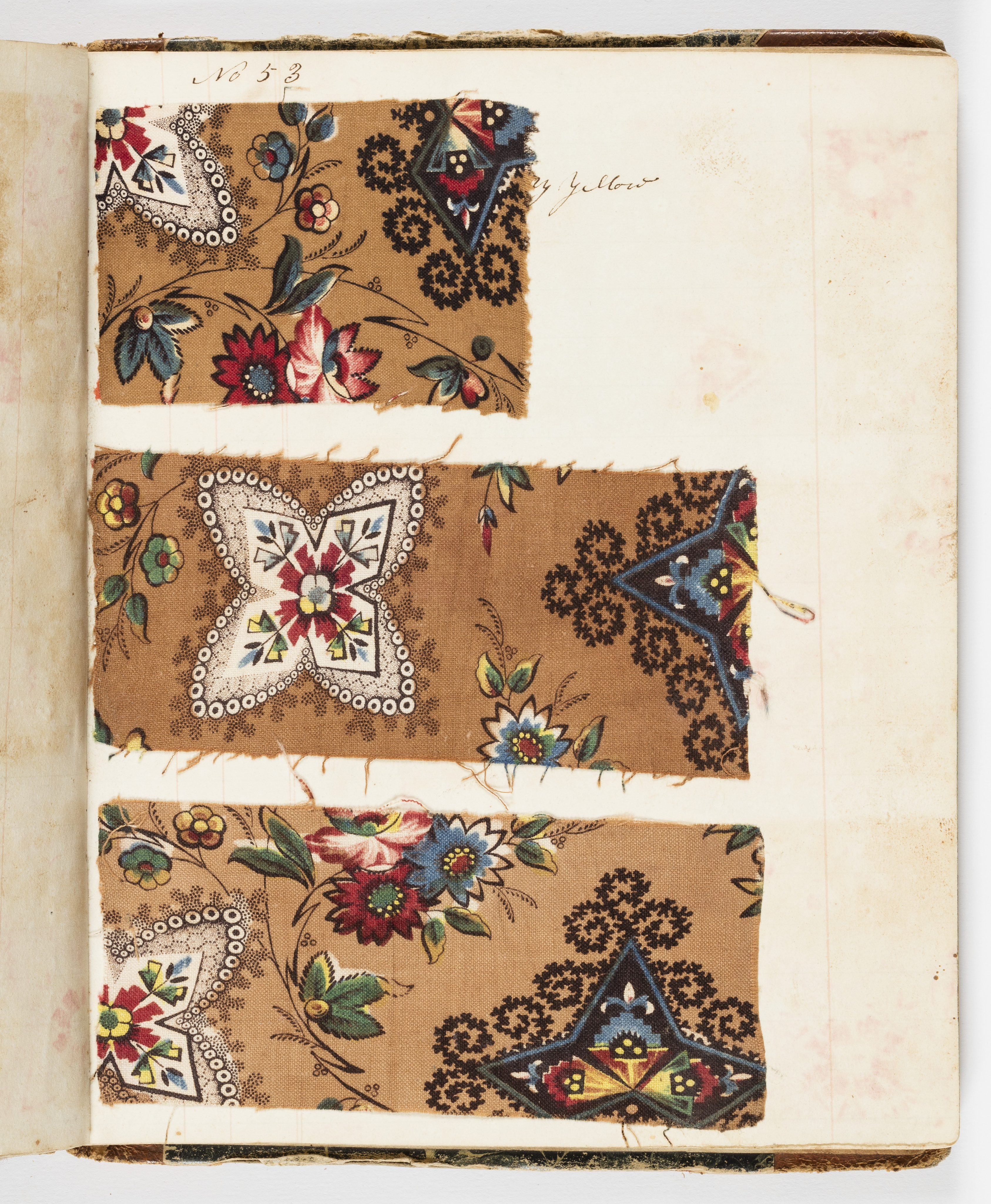 This is a Dyer's record book. It was made by Edmund Barnes. It is dated 1820–39 and we acquired it in 1950. Its medium is label: leather binding, pen and ink on paper pages, printed cotton samples. It is a part of the Textiles department.