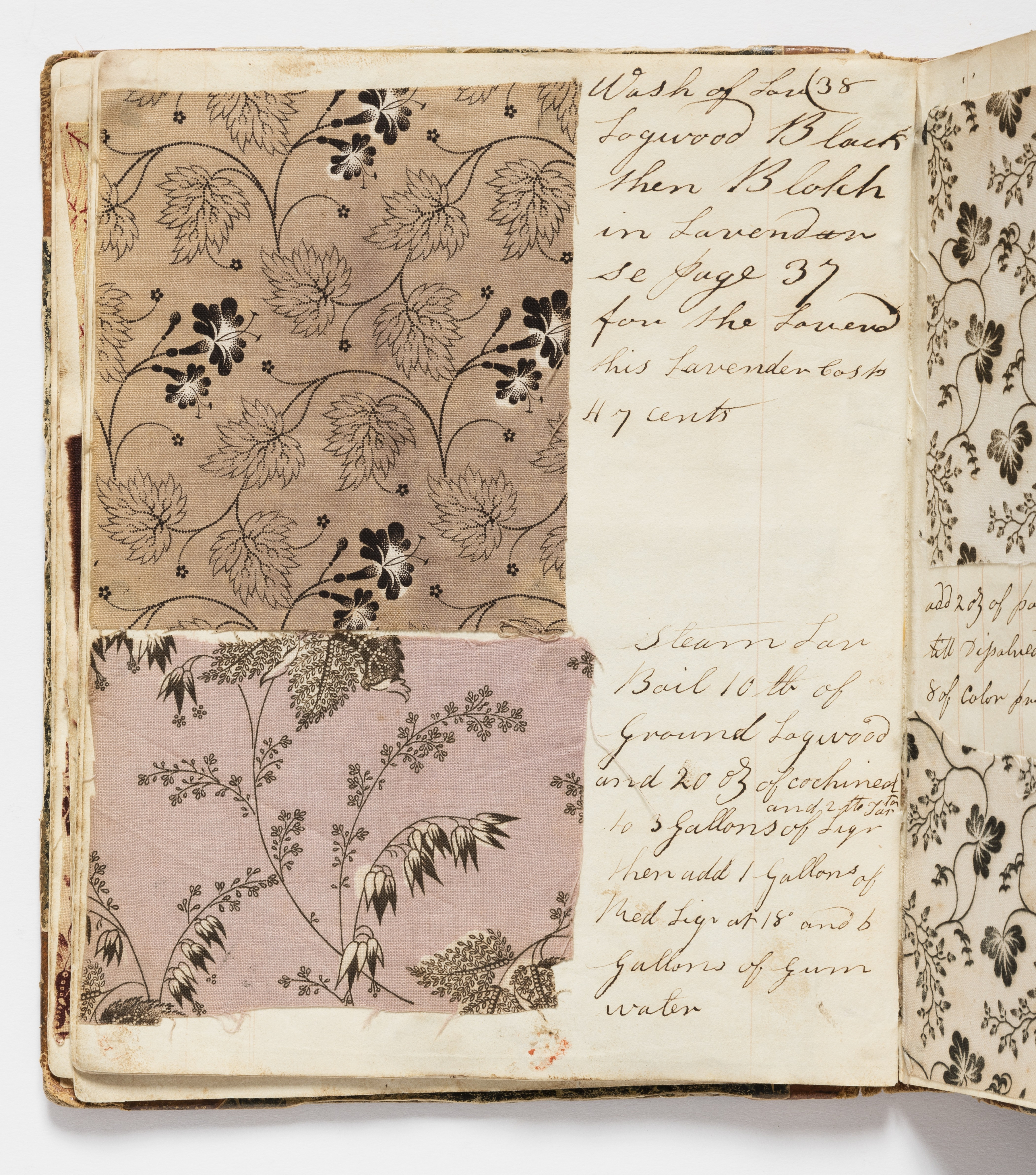 Study of Barnes’ book reveals that at some point in late 1820s, Barnes left England for New Hampshire where he was employed by the Dover Manufacturing Company to teach American apprentices the practice of “steam printing,” a process used to produce colorfast fabric. His first entry there is “Dover Nov 18th 1829," and he continued to add recipes and swatches until the early 1830s. “Providence” is inscribed on the inside back cover of the book, and research shows that Barnes left New Hampshire for Rhode Island as another of his record books is in the Museum at the Rhode Island School of Design.