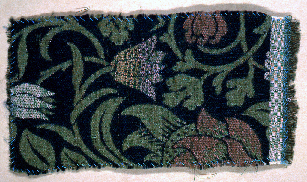 This is a Fragment. It was designed by William Morris and made by Merton Abbey. It is dated 1883 and we acquired it in 1951. Its medium is wool, mohair and its technique is woven on hand-loom jacquard. It is a part of the Textiles department.