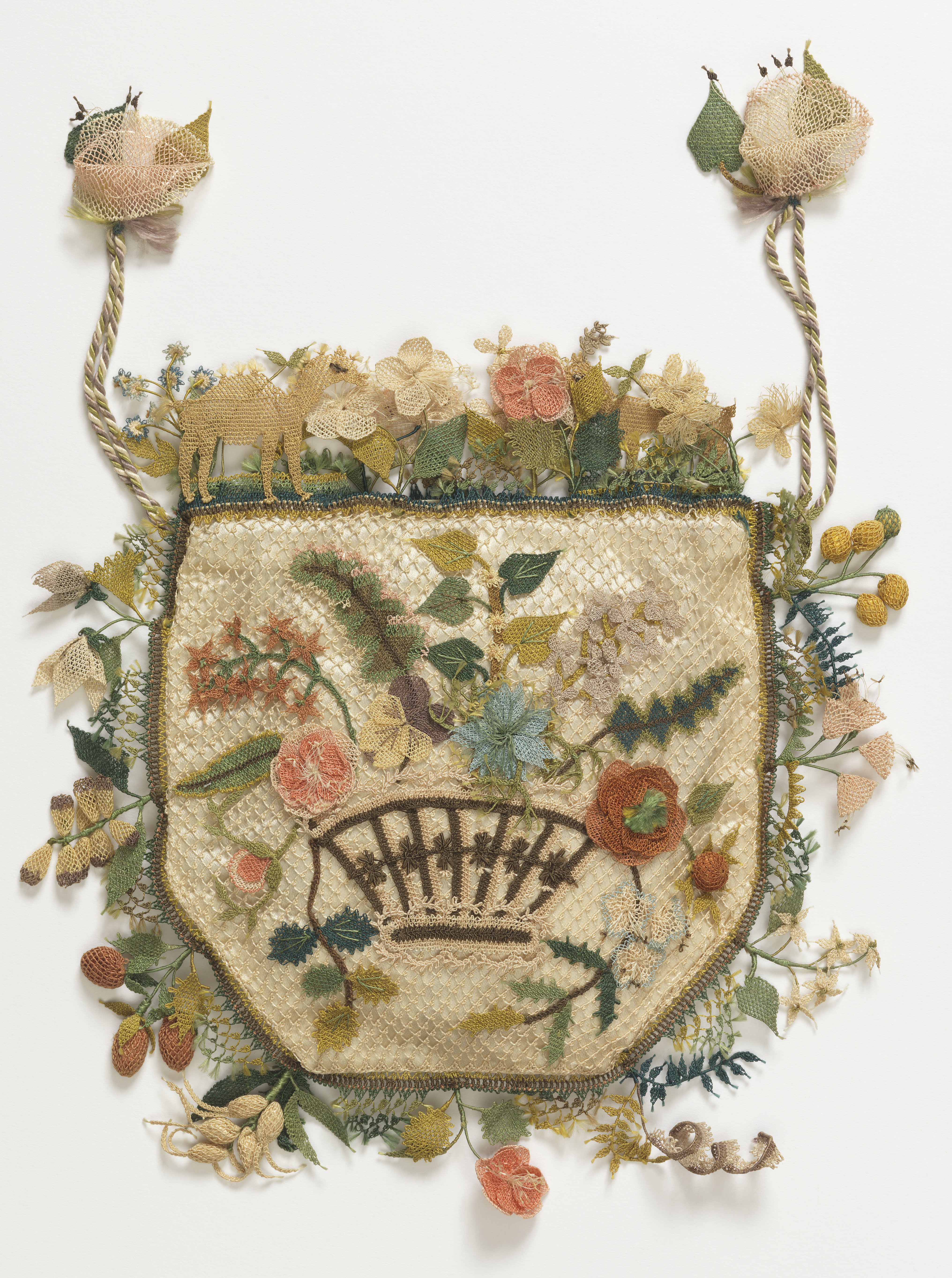 This charming purse from Turkey was likely produced for the growing market of foreign visitors as international tourism developed in the nineteenth century. It was made using a hooked needle similar to a tambour hook. The technique is an Eastern Mediterranean form of needle knotting, alternately known as bebilla, bibila or oya, and it produces an open, knotted net that is well-suited for the production of small, delicate trims of pendant-style flowers most often used on embroidered items or costume. At some point in the nineteenth century, larger accessories like this purse were produced, most likely in response to European interest in the technique. At first glance, the design seems conventional, but a small camel located on the top left gives it a hint of exoticism. Based on its pristine condition, it was likely tucked away and never used by its original owner.