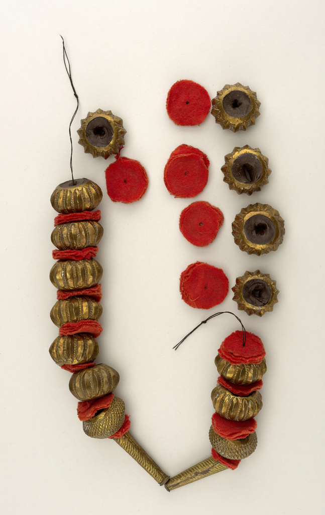 This is a necklace. It is dated probably 19th century and we acquired it in 1951. Its medium is thin metal (copper or gilt alloy). It is a part of the Product Design and Decorative Arts department.