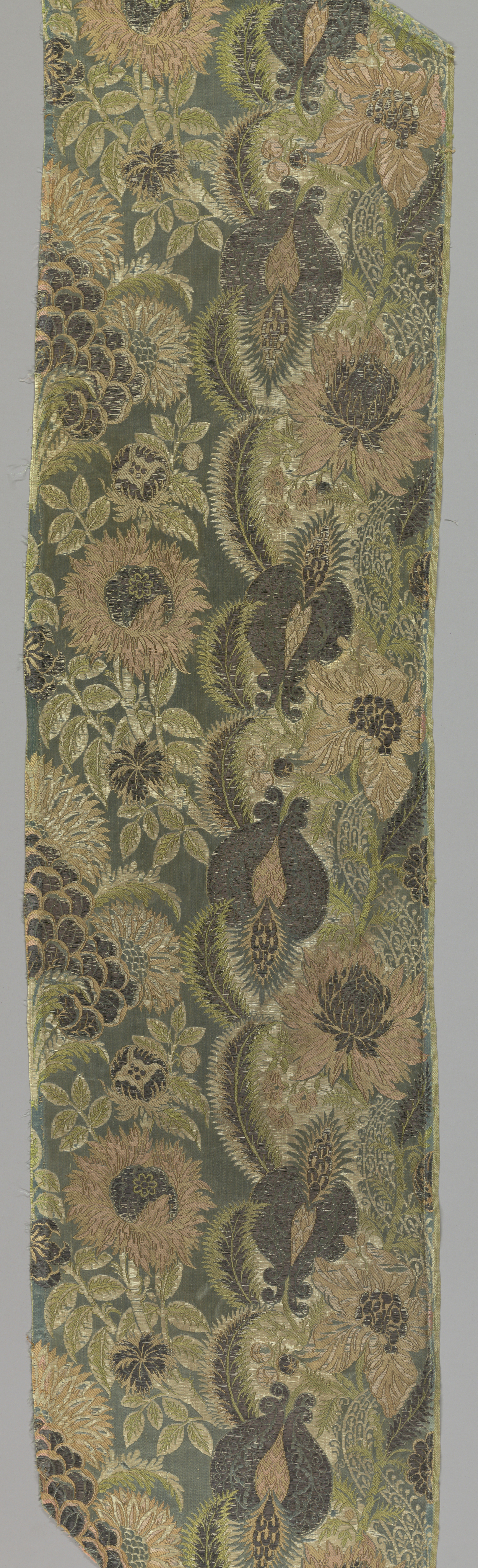 This is a Textile. It is dated 1700–1750 and we acquired it in 1951. Its medium is silk, silver foil on silk core and its technique is compound satin weave with brocading. It is a part of the Textiles department.