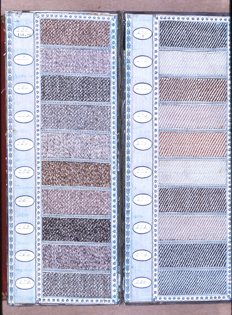 This is a Salesman's sample book. It is dated 19th century and we acquired it in 1951. Its medium is leather, paper, wool, cotton and its technique is plain and twill weave, some printed. It is a part of the Textiles department.