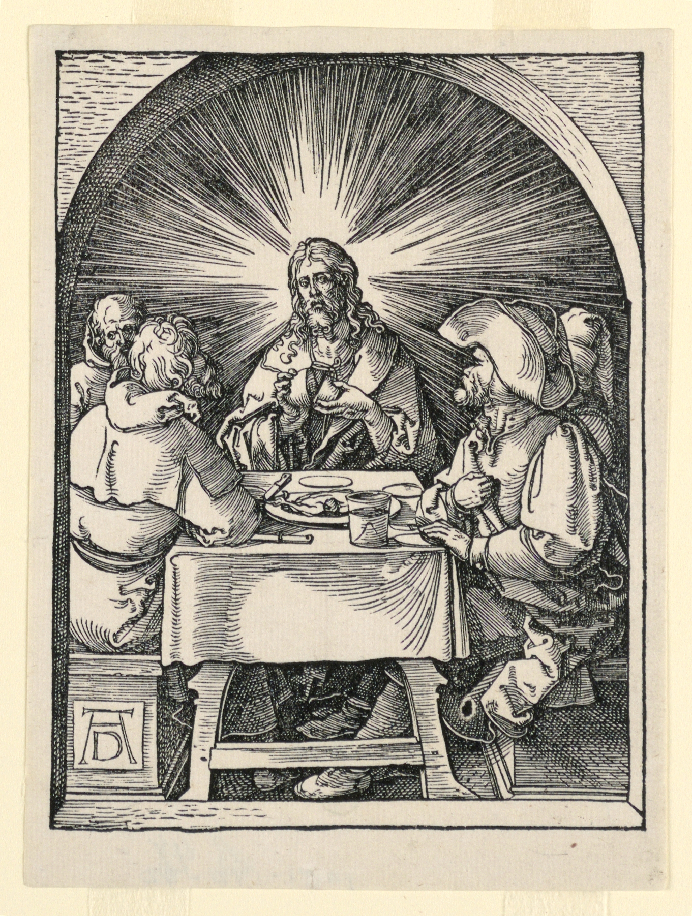Print, Christ at Emmaus, from The Little Passion Series; Designed by Albrecht Dürer (German, 1471–1528); Germany; woodcut on off-white laid paper; 14.3 × 10.7 cm (5 5/8 × 4 3/16 in.); Gift of Leo Wallerstein; 1951-170-32