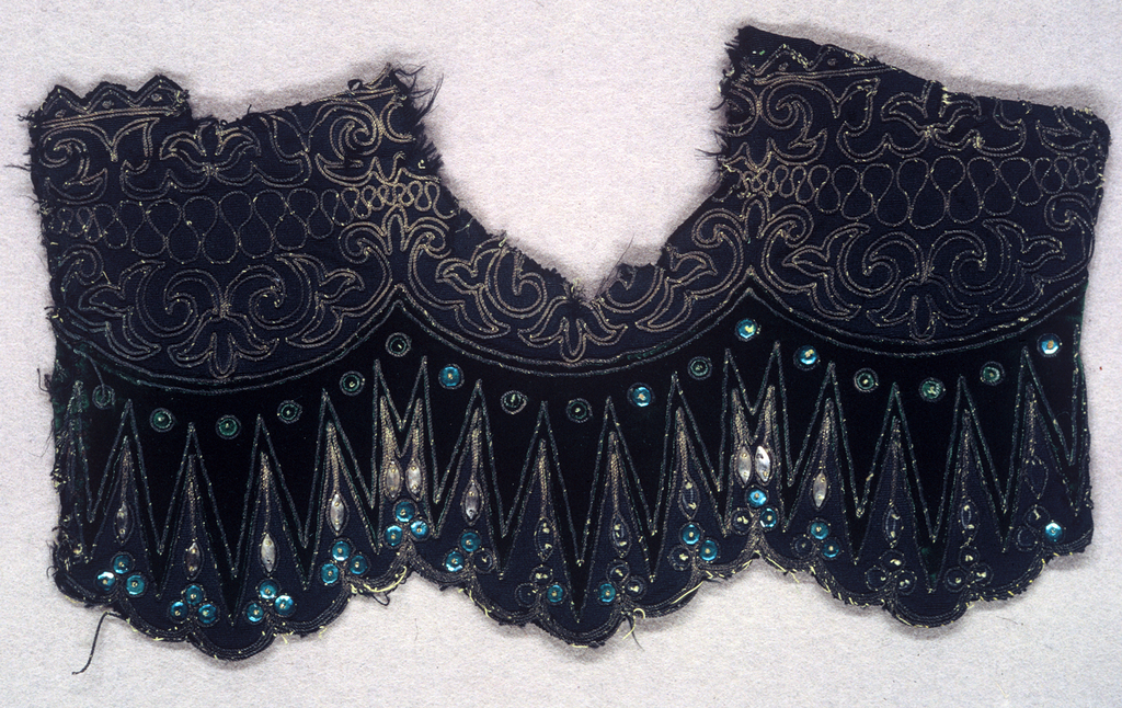 This is a Embroidery sample. It is dated 1875–1900 and we acquired it in 1951. Its medium is silk, metal, glass; section of dress-trimming and its technique is cloth with velvet applique, couched gold cord, glass sequins. It is a part of the Textiles department.