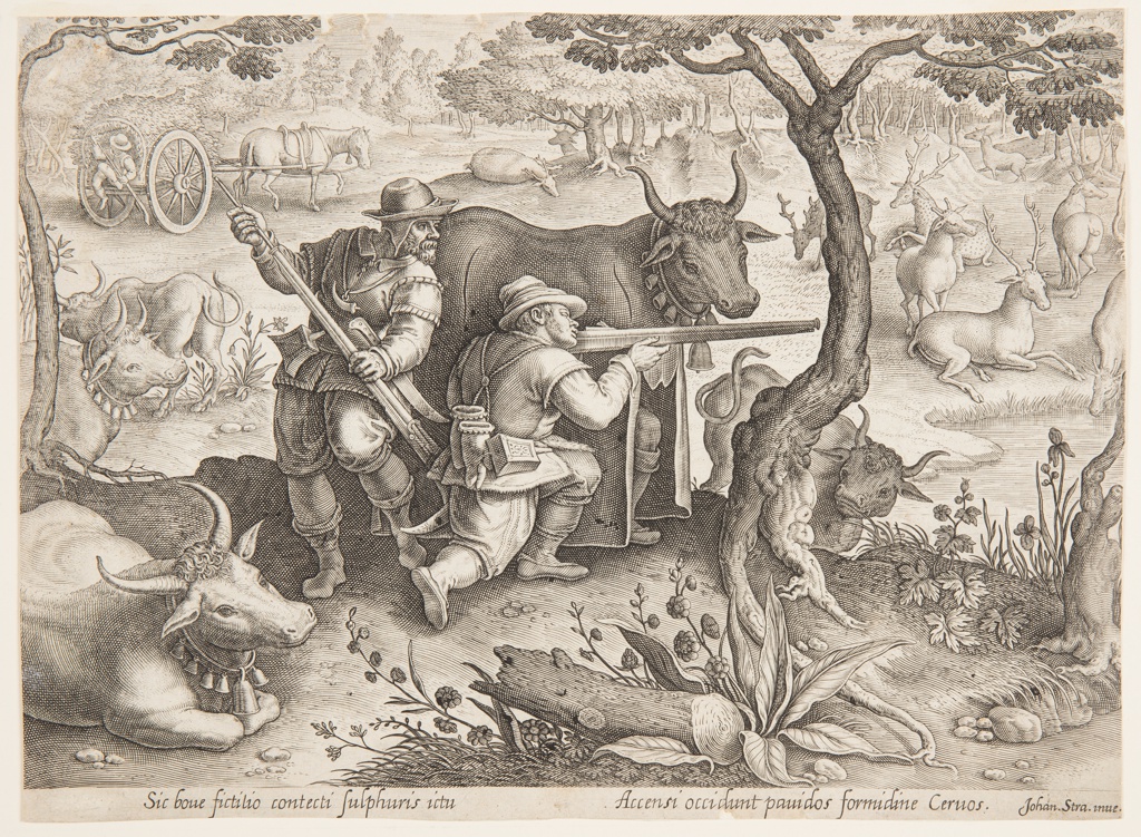 In margin below: SIC BOUE FICTILIO CONTECTI SULPHURIS ICTU ACCENSI OCCIDUNT PAUIDOS FORMIDINE CERUOS. JOHAN. STRA. INVE.