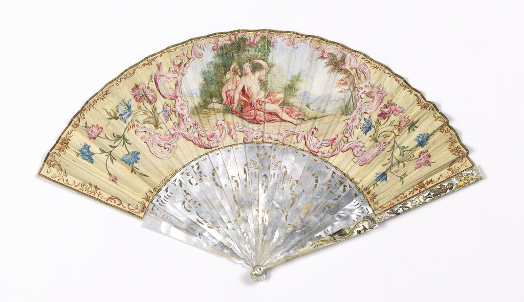 This is a Pleated fan. It is dated late 18th–early 19th century and we acquired it in 1952. Its medium is gilded parchment leaf painted in watercolors, carved and gilded mother-of-pearl sticks with gold and silver foil. It is a part of the Textiles department.