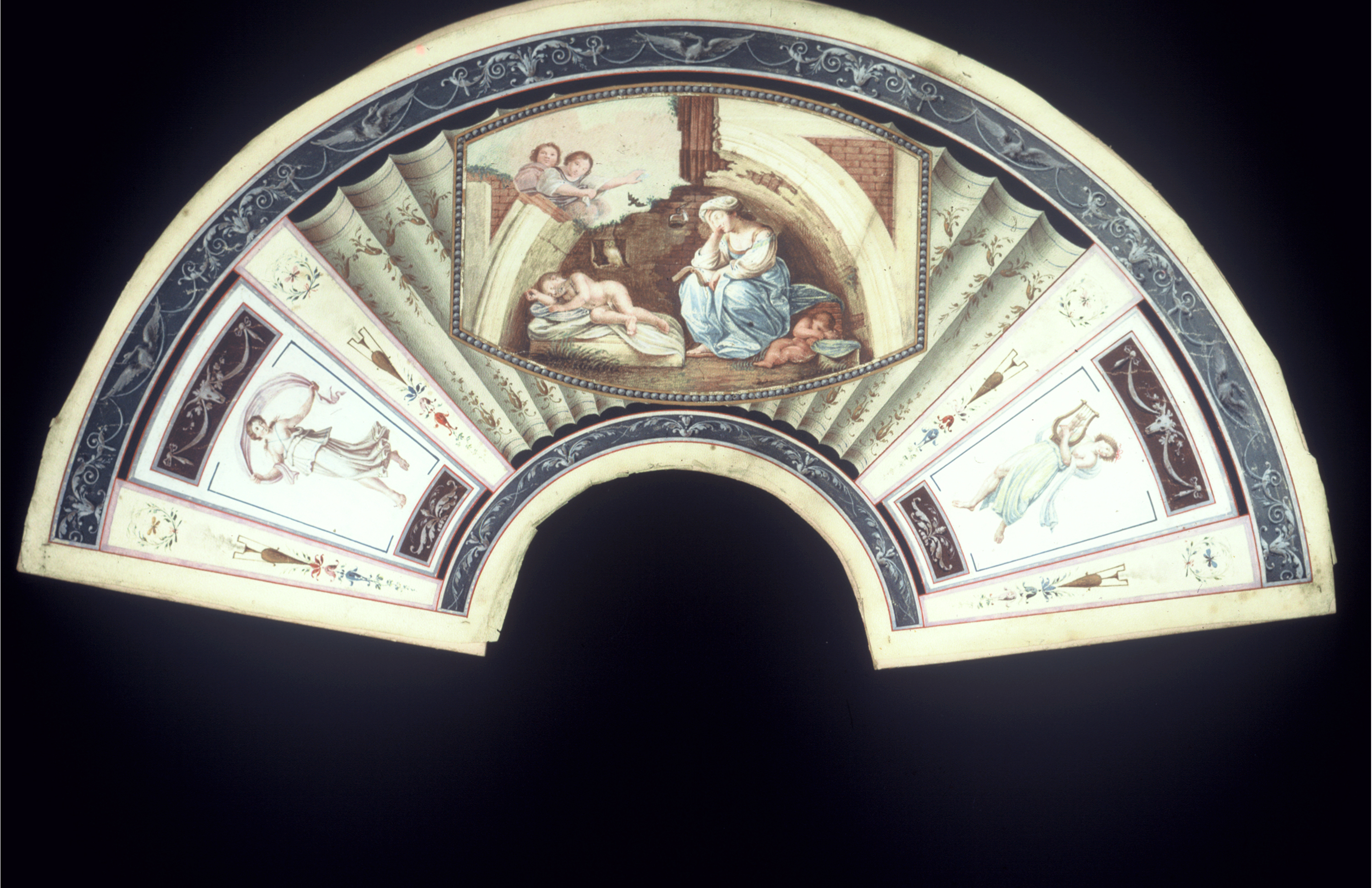 This is a Fan leaf. It is dated late 18th century and we acquired it in 1952. Its medium is gouache-painted parchment. It is a part of the Textiles department.