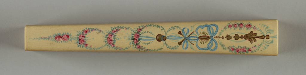 Pleated Fan And Case; painted silk leaf, pierced, gilded and painted ivory sticks, paste jewel and metal bail at rivet ; Open: 40.6 cm (16 in.); Gift of Anonymous Donor; 1952-161-241-a,b