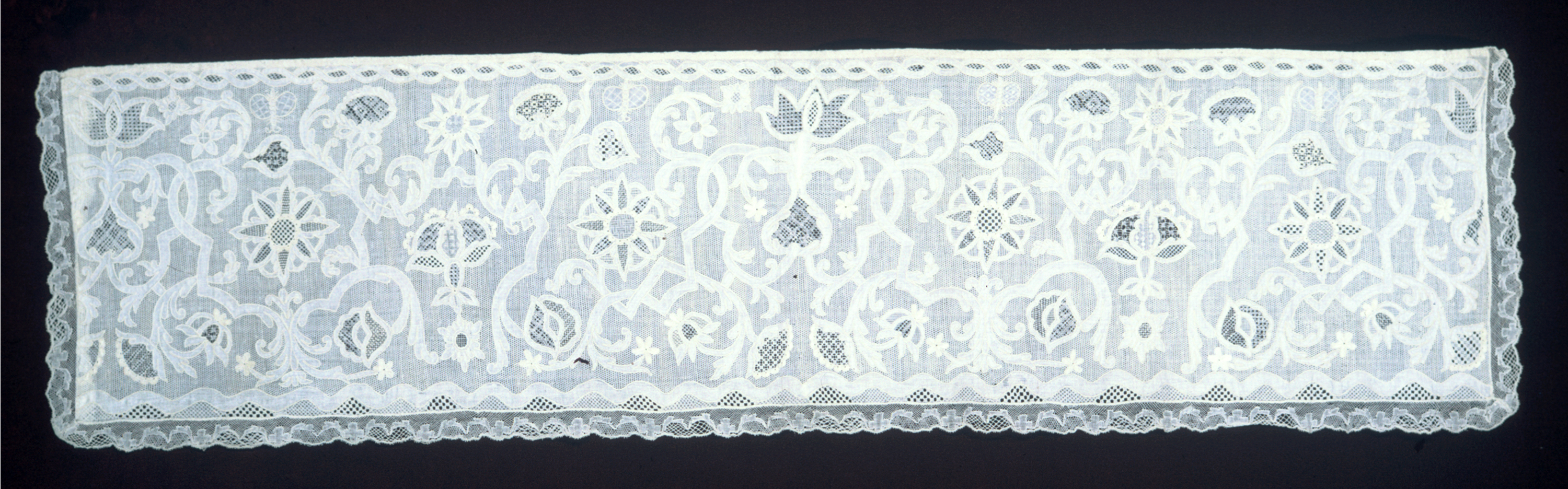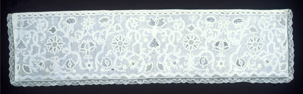 This is a panel. It is dated late 18th century and we acquired it in 1952. Its medium is linen and its technique is deflected element and withdrawn element work. It is a part of the Textiles department.