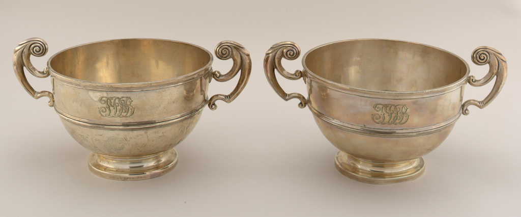 Underneath foot of each bowl: [1] "Made in England/for Tiffany & Co", stamped (sponsor's mark) On side of each bowl, under rim and near handle: [2] "&" over "W W" into trefoil, stamped (maker's mark, Wakely & Wheeler, 1909-1957) [3] letter "A" in quatrefoil, stamped (Dublin date letter for 1916) [4] Hibernia, stamped (town mark, Dublin) [5] crowned harp, stamped (standard mark, Dublin).