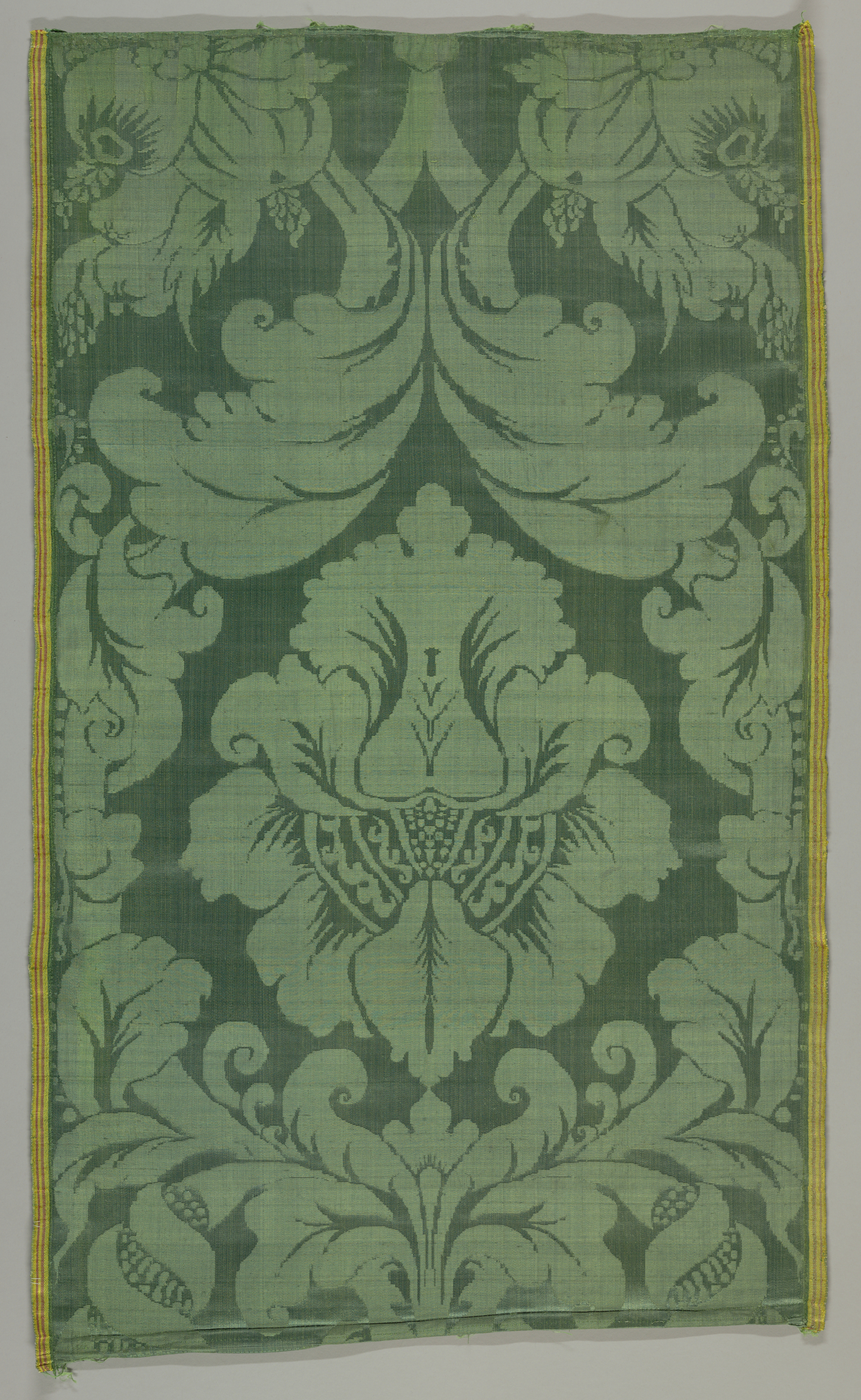This is a Textile. It is dated late 17th–early 18th century and we acquired it in 1952. Its medium is silk and its technique is 4&1 satin damask; background is the warp float face of the satin. It is a part of the Textiles department.