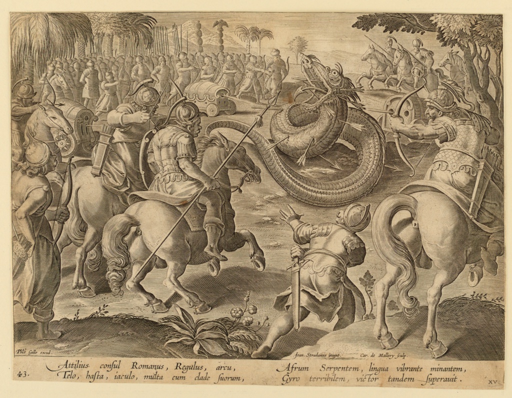 Print, The Roman Consul Attilius Regulus Fighting a Giant African Serpent, plate 25 in the Venationes Ferarum series; Designed by Jan van der Straet, called Stradanus (Flemish, 1523–1605); Engraved by Karel van Mallery; Published by Philips Galle (Flemish, 1537 - 1612); Subject: Pliny the Elder (Roman, 23 - 79 CE); Netherlands; engraving on paper; 19.7 × 26.2 cm (7 3/4 × 10 5/16 in.); Gift of Mrs. A. W. Erickson; 1952-37-15