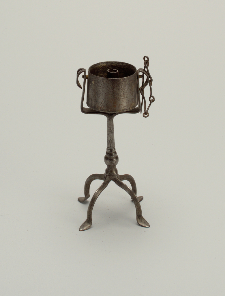 This is a oil lamp. It is dated 19th century and we acquired it in 1952. Its medium is steel. It is a part of the Product Design and Decorative Arts department.