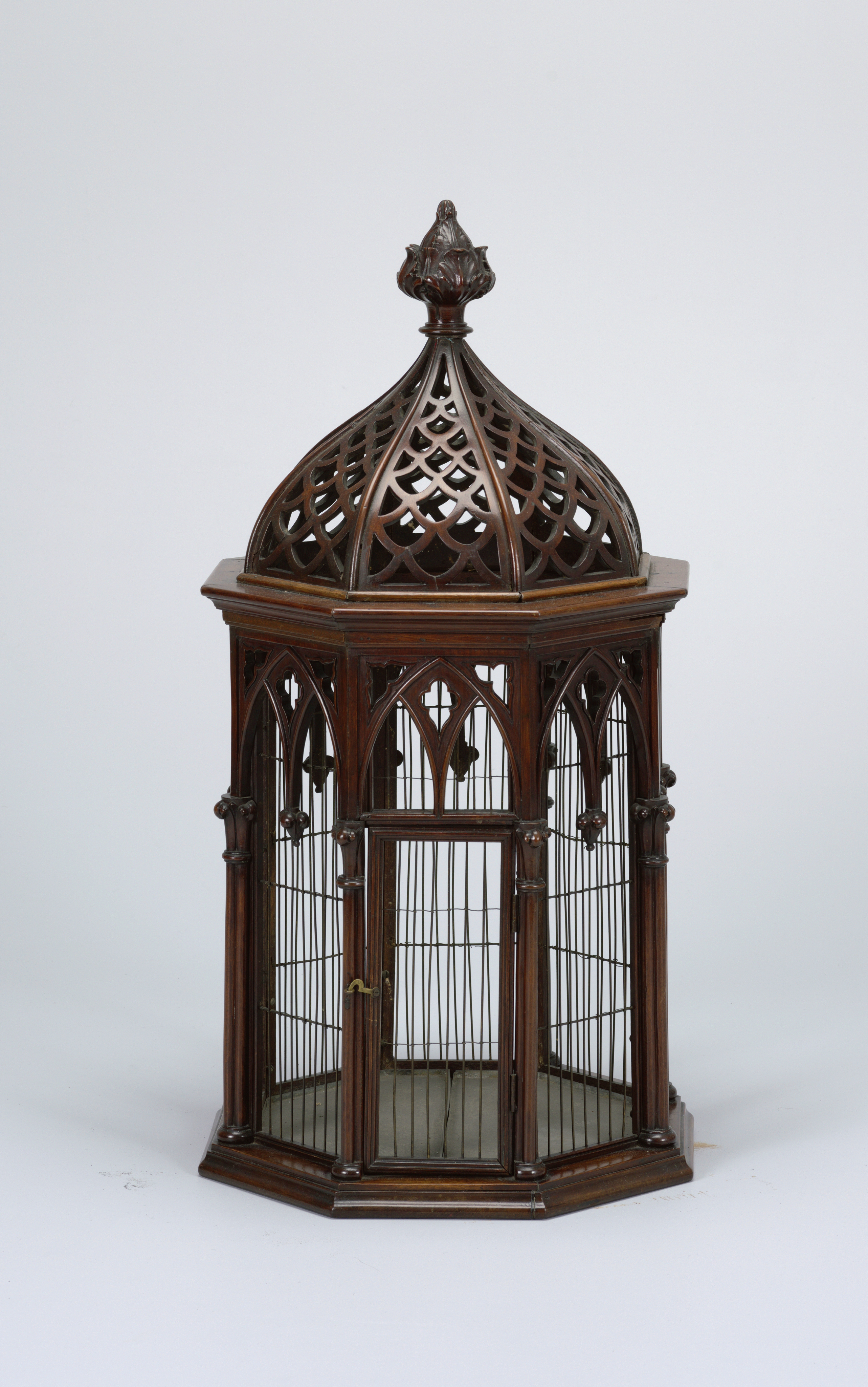 Birdcage (England); carved and joined mahogany, metal wire, sheet metal; H x W x D: 77 x 39 x 39cm (30 5/16 x 15 3/8 x 15 3/8in.); Gift of Alfred G. Burnham; 1952-69-1