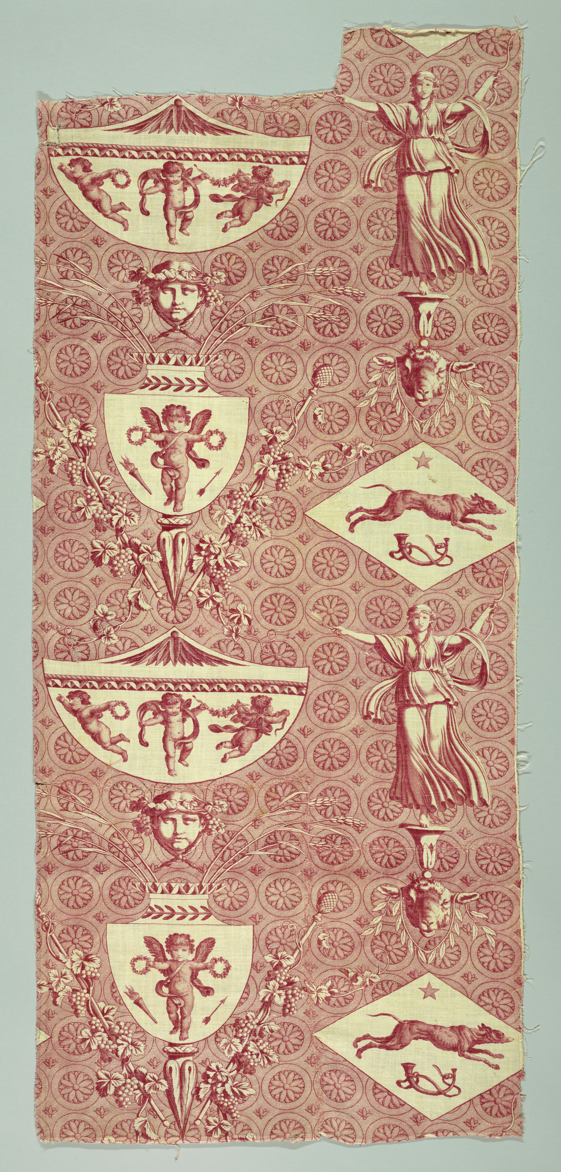 This is a Textile. It is dated 1805–1810 and we acquired it in 1952. Its medium is cotton and its technique is printed by engraved copper plate on plain weave. It is a part of the Textiles department.