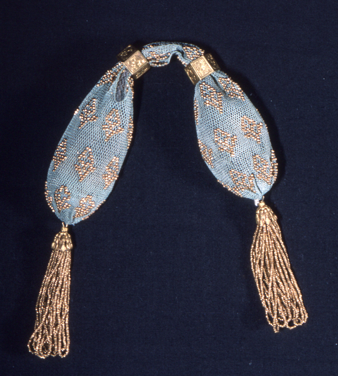 This is a Miser's purse. It is dated 1800–1820 and we acquired it in 1953. Its medium is silk, metallic beads and its technique is beaded netting. It is a part of the Textiles department.