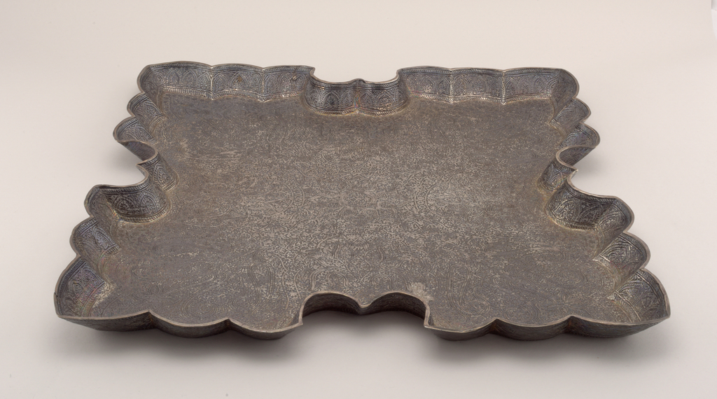 This is a tray. We acquired it in 1953. Its medium is silver. It is a part of the Product Design and Decorative Arts department.