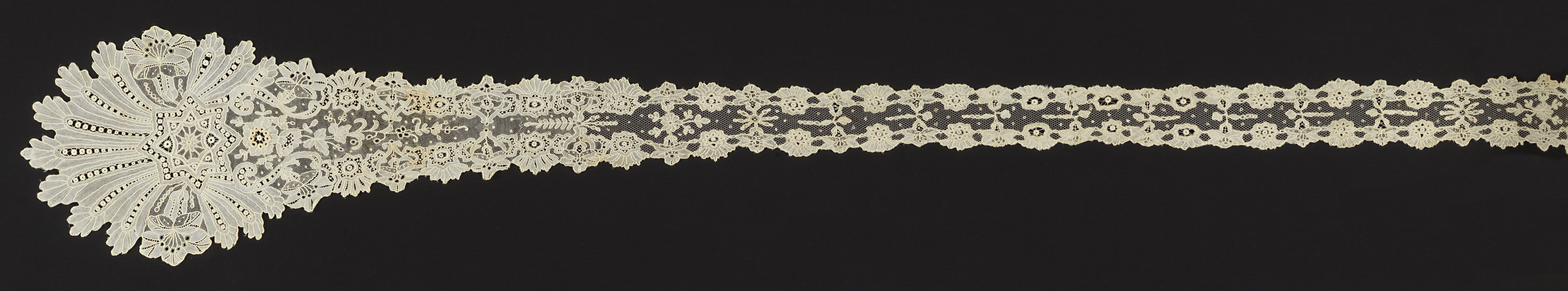 This is a Tie. It is dated 1850–1900 and we acquired it in 1953. Its medium is linen and its technique is needle lace with ground of loop & twist with loop & twist return. It is a part of the Textiles department.