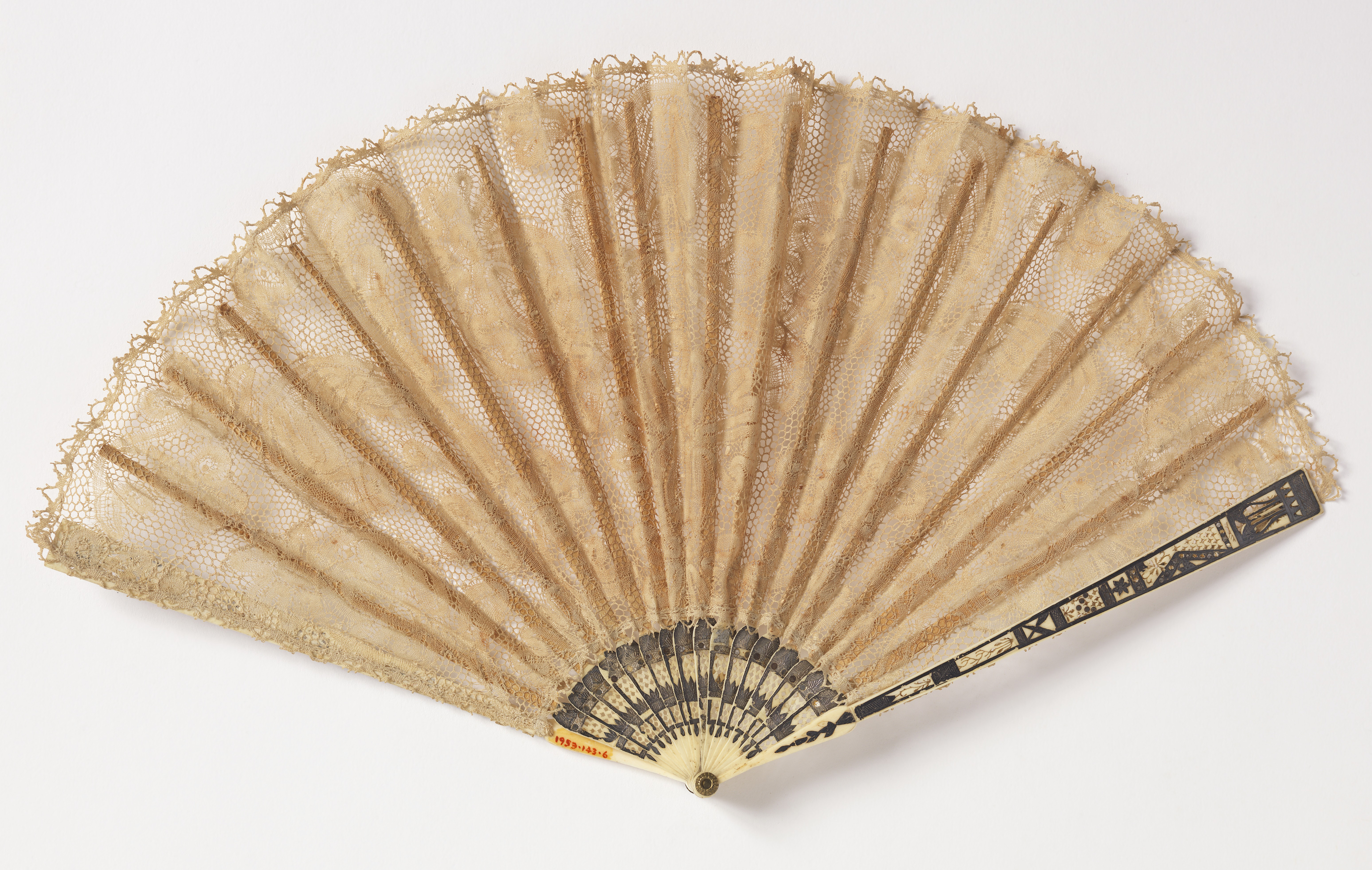 This is a Pleated fan. It is dated ca. 1820 and we acquired it in 1953. Its medium is linen bobbin lace leaf, pierced ivory sticks piquéd, incised and silvered. It is a part of the Textiles department.