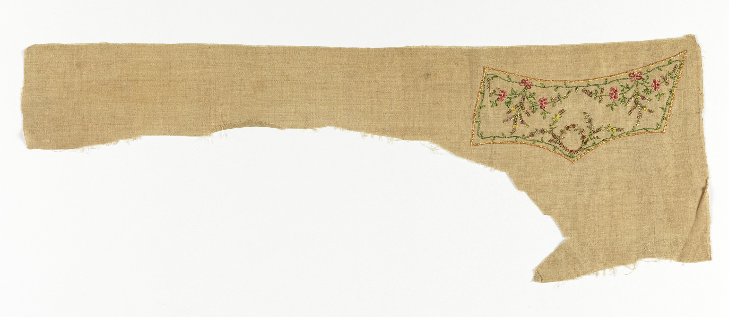 This is a Waistcoat, uncut. It is dated ca. 1750–1800 and we acquired it in 1953. Its medium is linen, silk and its technique is embroidery (chain stitch). It is a part of the Textiles department.