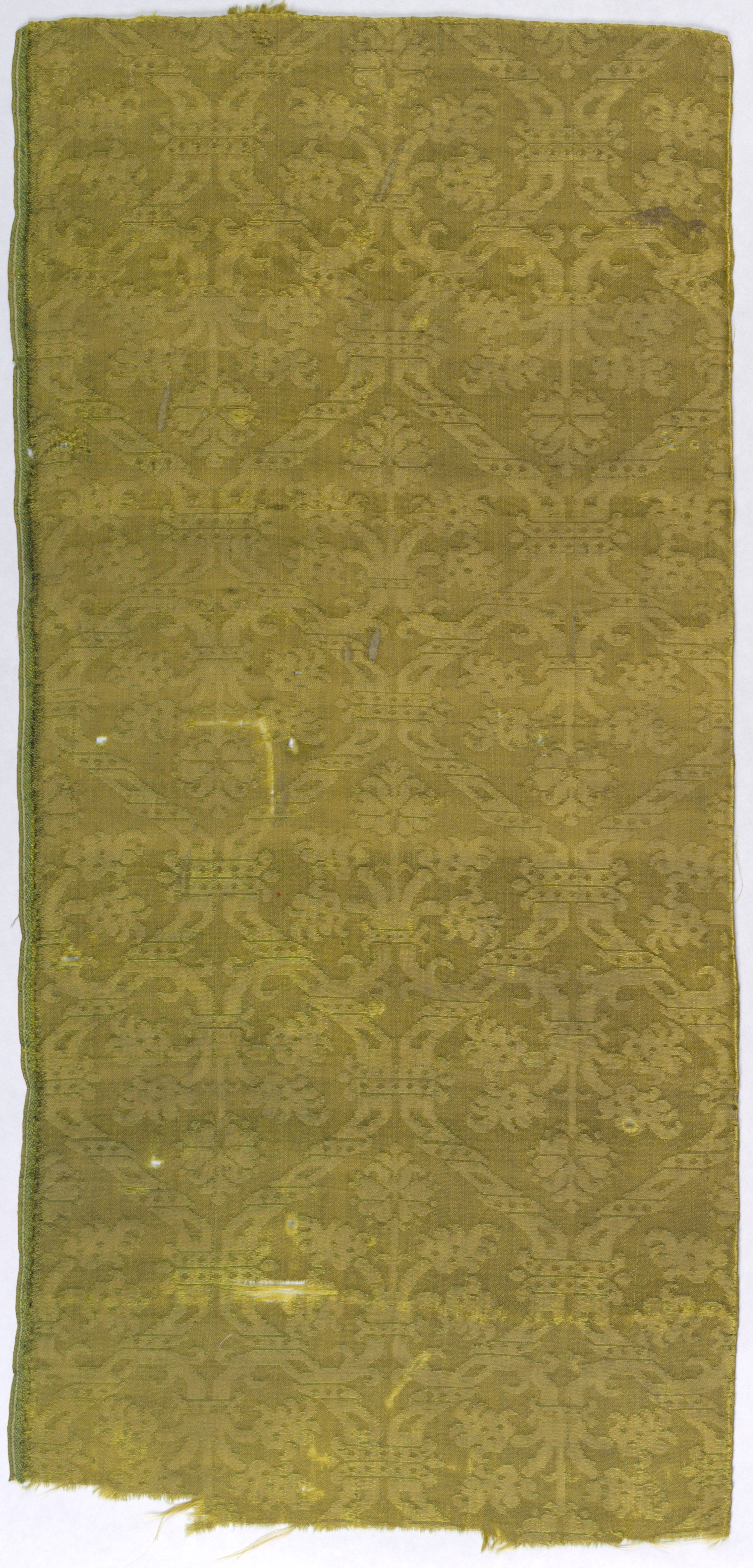 This is a Fragment. It is dated 16th century and we acquired it in 1953. Its medium is silk and its technique is 5-harness satin damask. It is a part of the Textiles department.