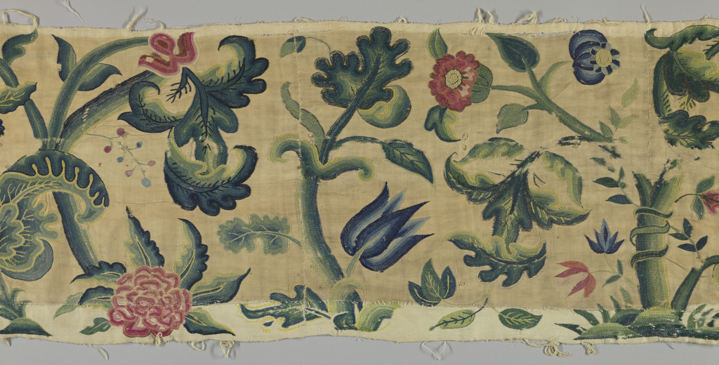 This is a Textile. It is dated 18th century and we acquired it in 1953. Its medium is linen, wool and its technique is crewel embroidery on plain weave. It is a part of the Textiles department.