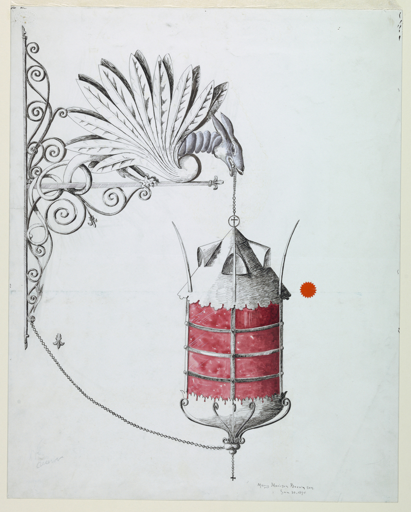 Drawing, Design for a Wrought Iron Light Fixture; Mary Morison Brownson (American); Student at Cooper Union Art School; USA; pen and ink, watercolor on bristol board. red seal.; H x W: 52.9 × 42 cm (20 13/16 × 16 9/16 in.); Gift of Cooper Union Art School; 1953-31-2