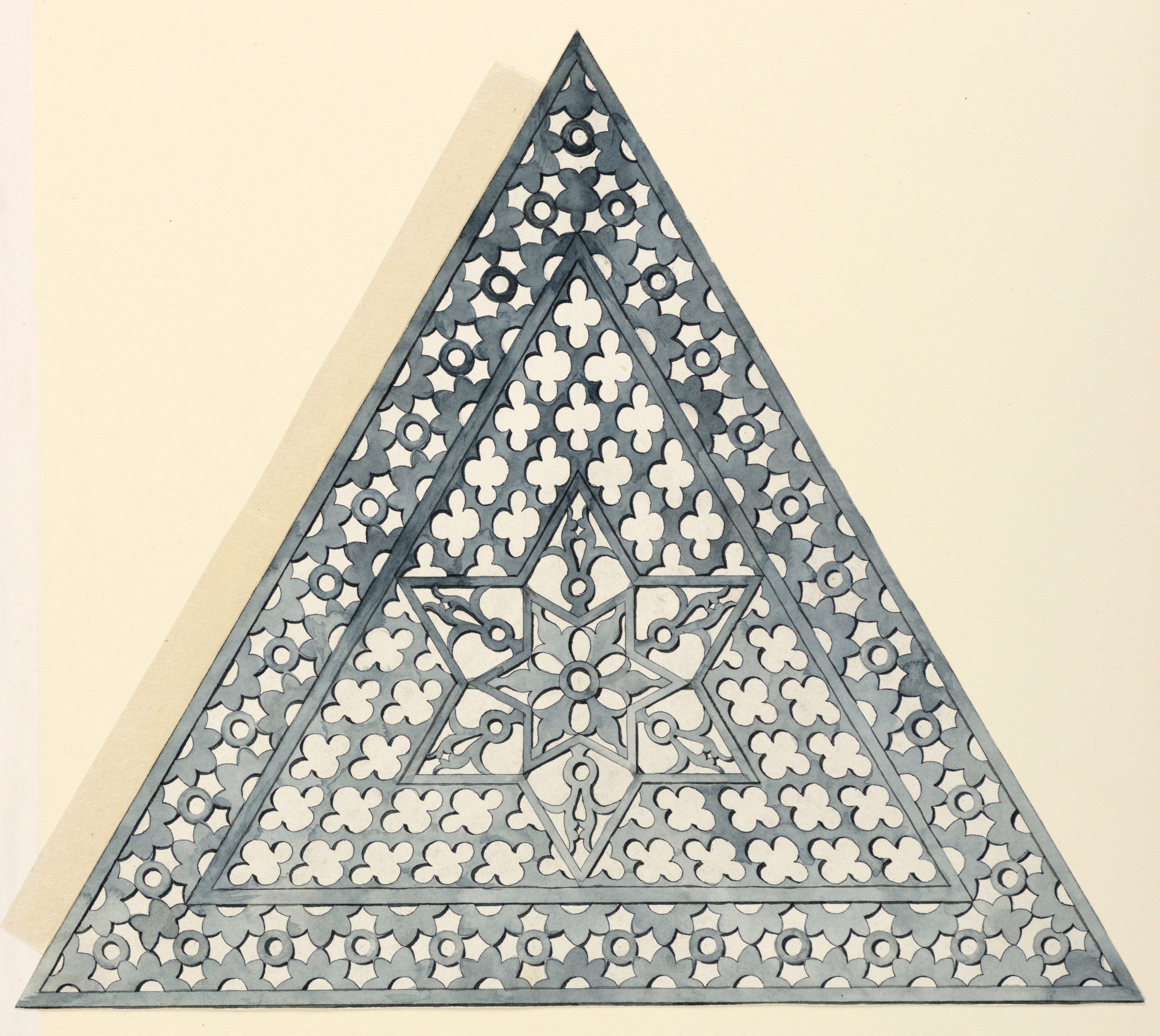 Drawing, Design for pierced marble grillework; J.D. Woodward; Student at Cooper Union Art School; USA; pen and ink with blue watercolors on paper marble grillework; H x W: 32.7 × 38 cm (12 7/8 × 14 15/16 in.); Gift of Cooper Union Art School; 1953-31-28