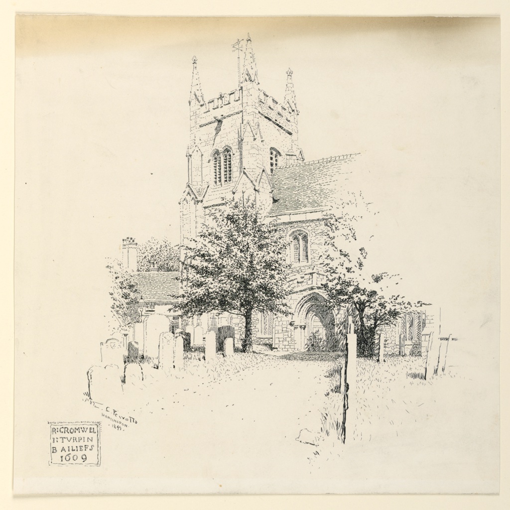 Drawing, St. Mary's Church, Huntingdon; Ernest Clifford Peixotto (American, 1869–1940); Published by Charles Scribner's Sons; USA; pen and ink on illustration board; 28.7 × 29.3 cm (11 5/16 × 11 9/16 in.); 1953-48-14