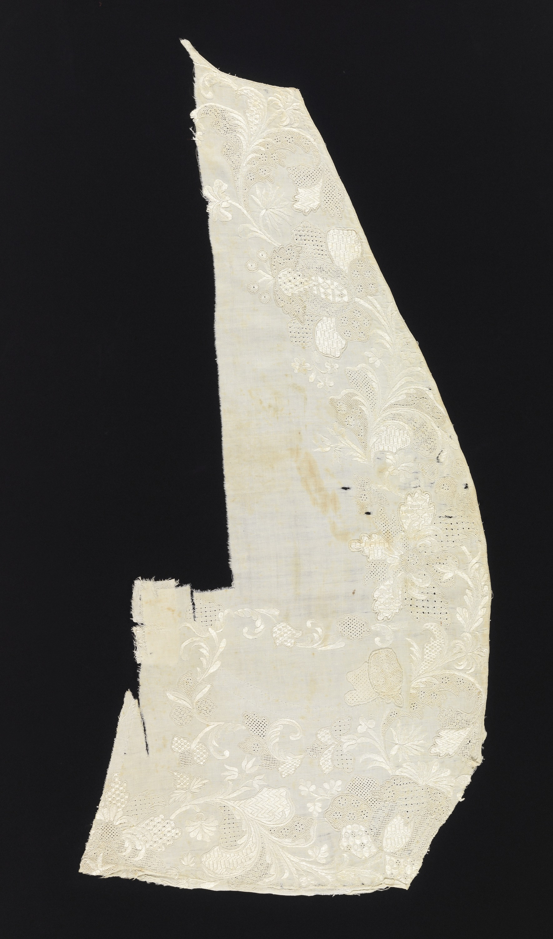 This is a Waistcoat, uncut. It is dated 18th century and we acquired it in 1953. Its medium is linen, cotton and its technique is embroidery. It is a part of the Textiles department.