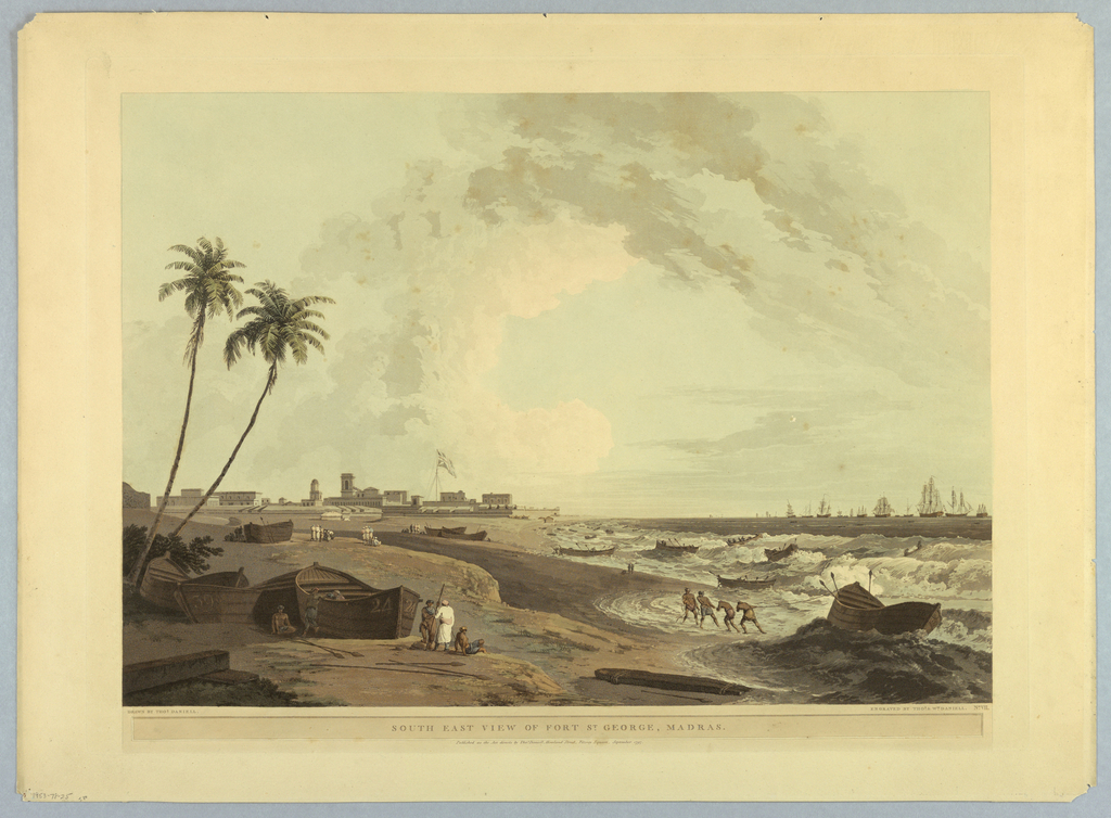 Print, South East View of Fort St. George, Madras, from "Oriental Scenery: Twenty Four Views in Hindoostan"; Print Maker: Thomas Daniell (British, 1749 - 1840); England; colored aquatint on paper; 1953-78-25